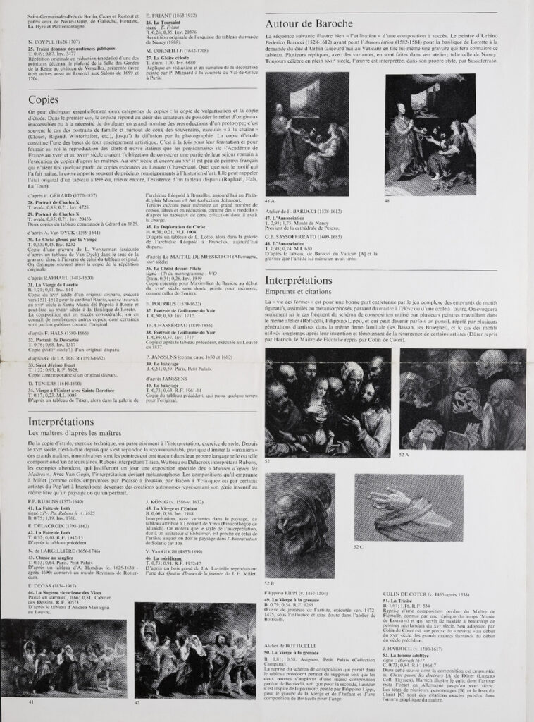Έντυπο, στα γαλλικά, δίφυλλο (4 σελίδες), χαρτί, 44×32 εκ., αφιερωμένο σε έκθεση με θέμα τα αντίγραφα έργων τέχνης που πραγματοποιήθηκε στο Παρίσι το 1973.