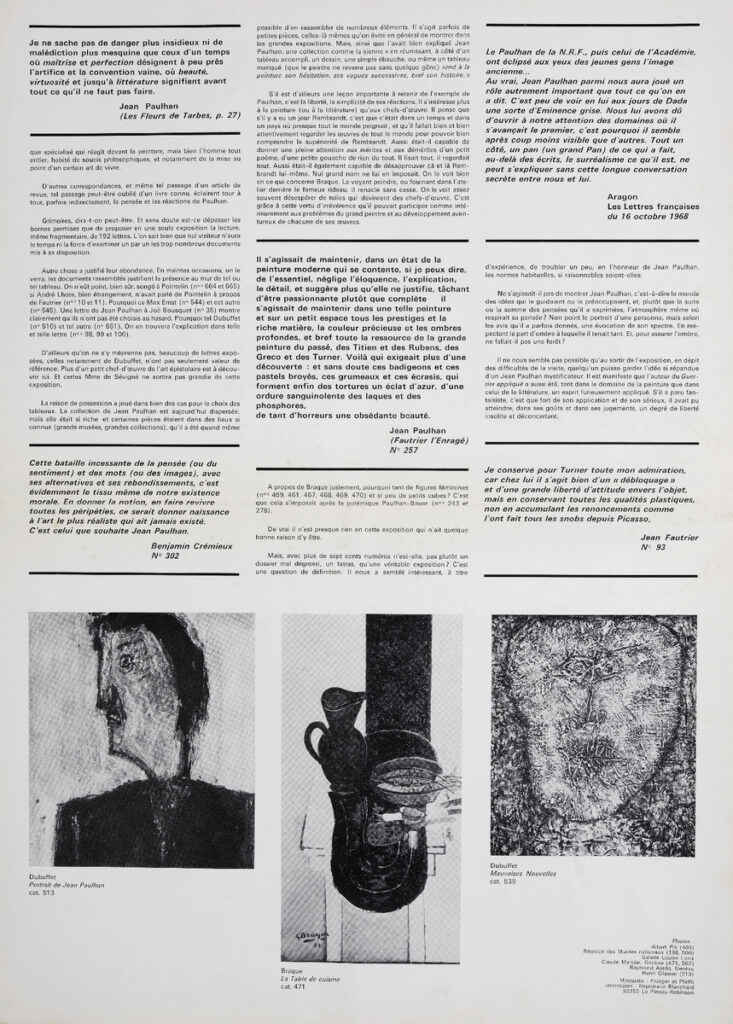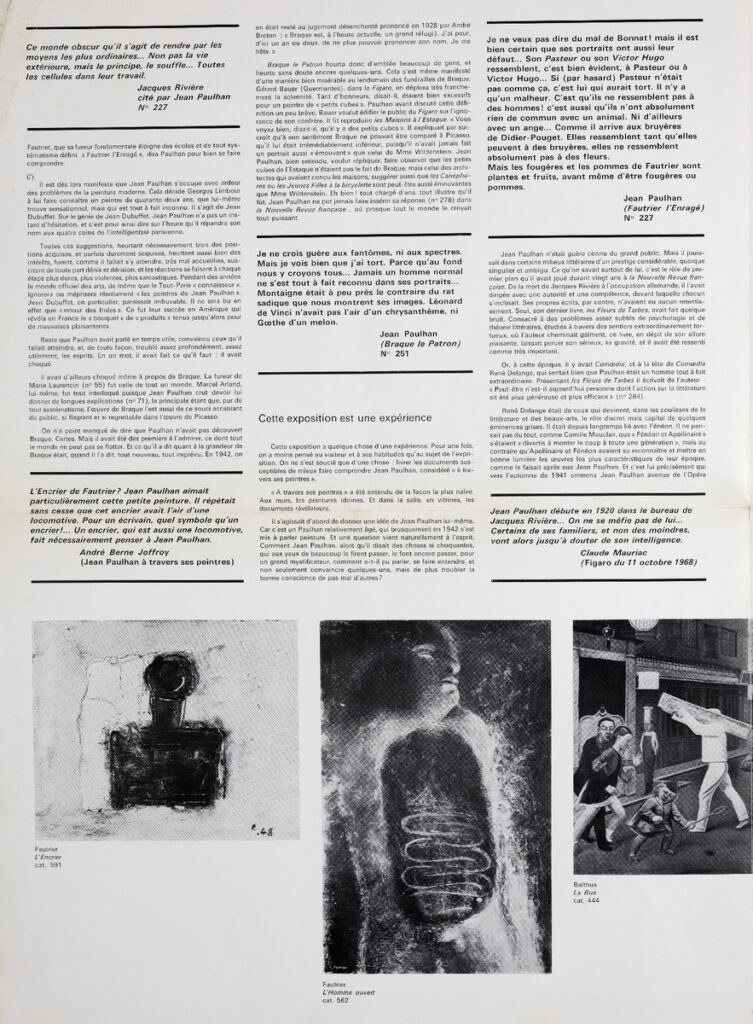 Έντυπο, στα γαλλικά, δίφυλλο (4 σελίδες), χαρτί, 44×32 εκ., αφιερωμένο σε έκθεση με θέμα τον Γάλλο συγγραφέα, κριτικό και εκδότη Jean Paulhan που πραγματοποιήθηκε στο Παρίσι το 1974. Περιέχει αποσπάσματα κριτικών.