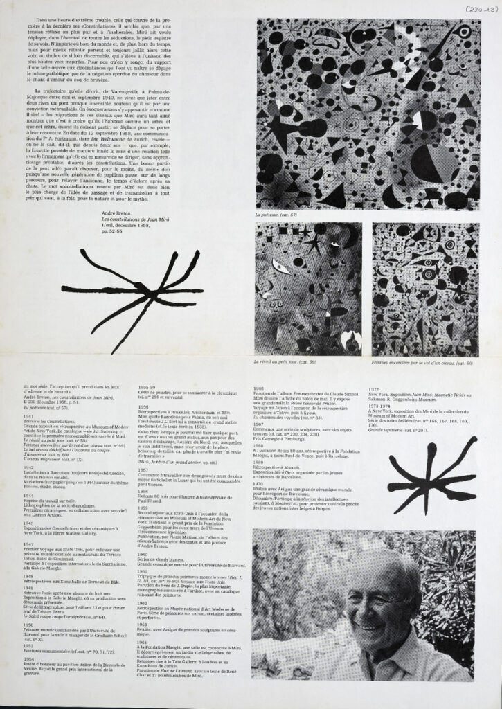 Έντυπο, στα γαλλικά, δίφυλλο (4 σελίδες), χαρτί, 46×33 εκ., αφιερωμένο σε αναδρομική έκθεση του Καταλανού ζωγράφου Juan Miró, που πραγματοποιήθηκε στο Παρίσι το 1974.