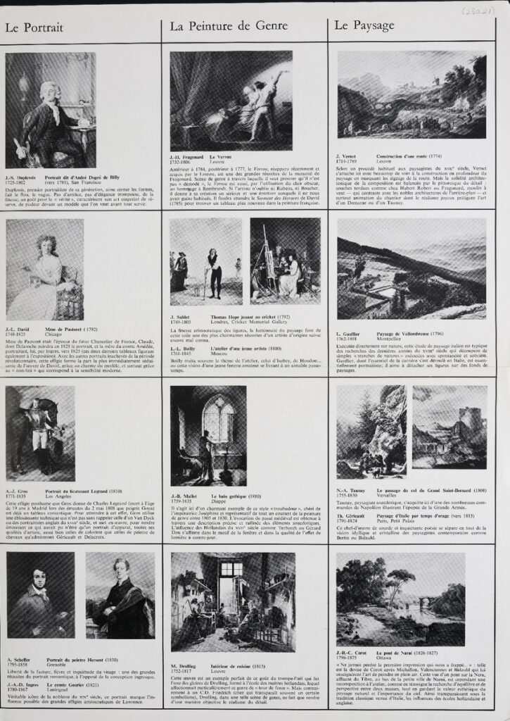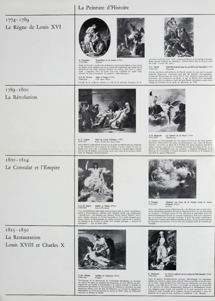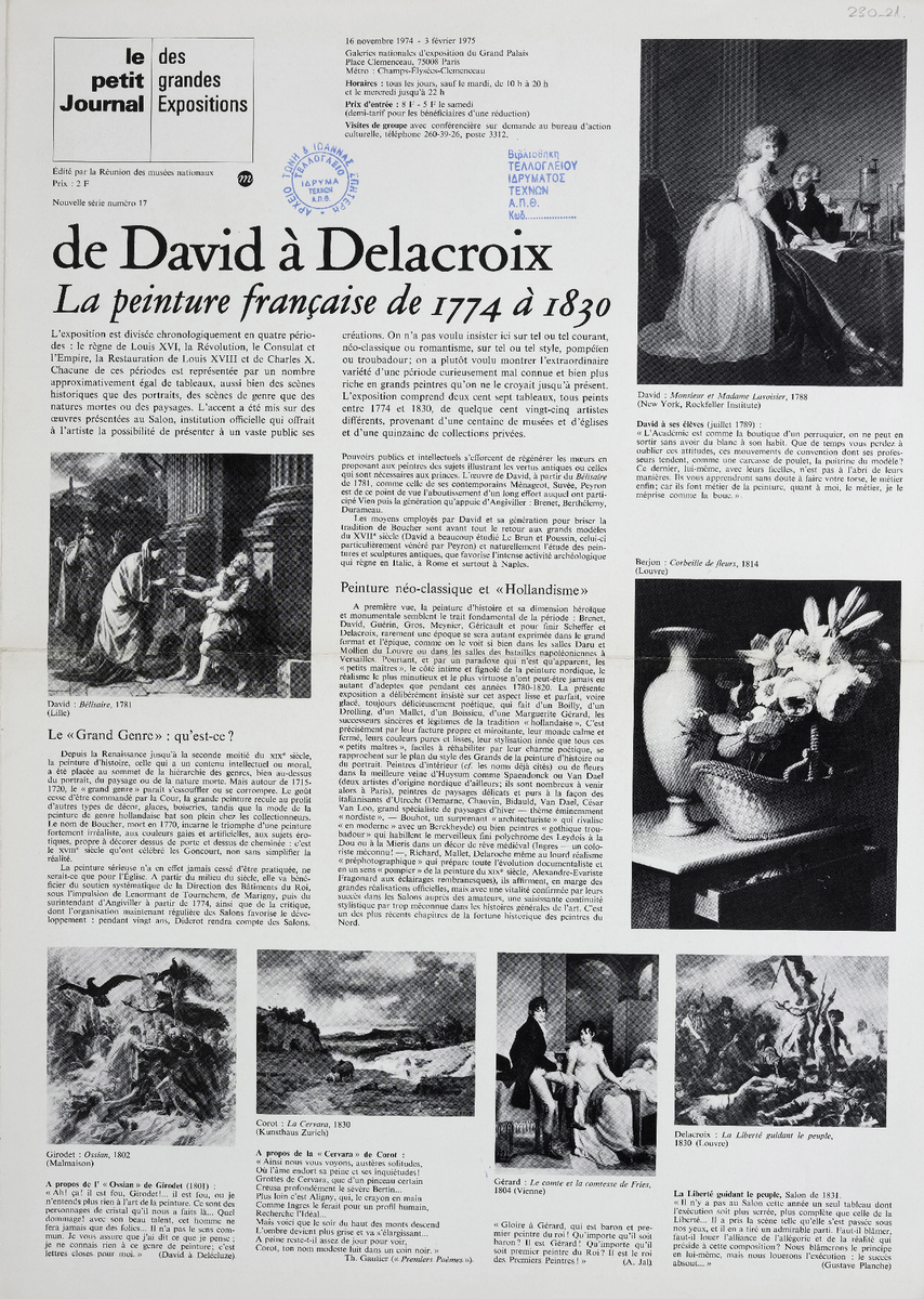 Έντυπο, στα γαλλικά, δίφυλλο (4 σελίδες), χαρτί, 46×33 εκ., αφιερωμένο στην έκθεση γαλλικής ζωγραφικής της περιόδου 1774-1830, που πραγματοποιήθηκε στο Παρίσι το 1974.