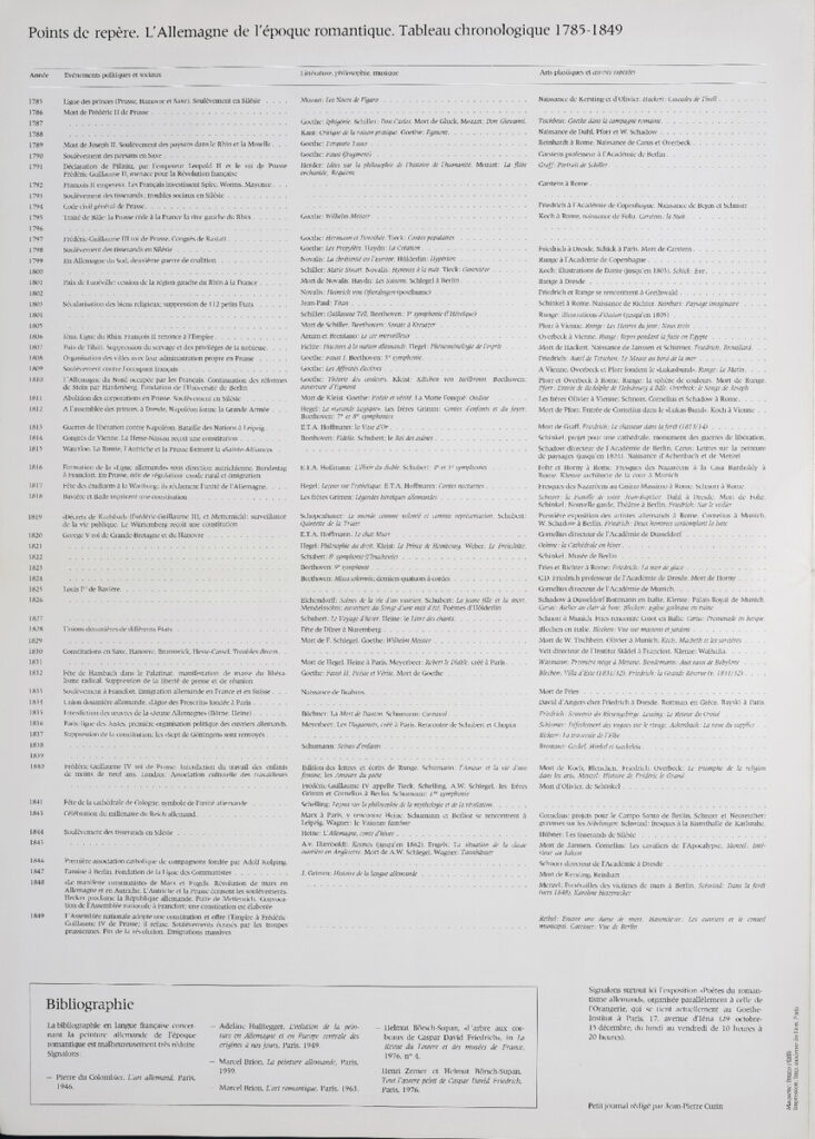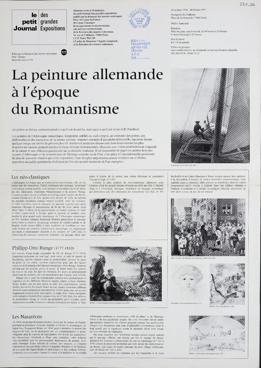 Έντυπο, στα γαλλικά, δίφυλλο (4 σελίδες), χαρτί, 46×33 εκ., αφιερωμένο στην έκθεση γερμανικής ζωγραφικής της ρομαντικής περιόδου, που πραγματοποιήθηκε στο Παρίσι το 1976.