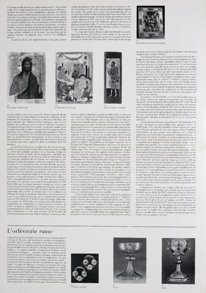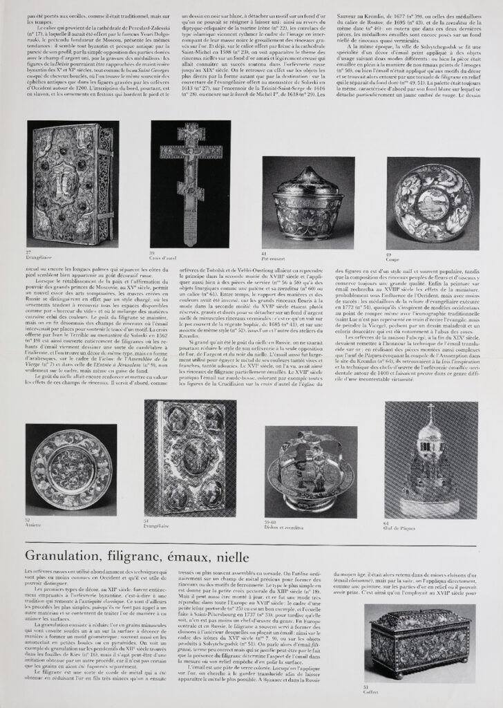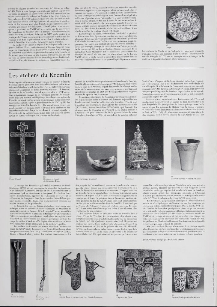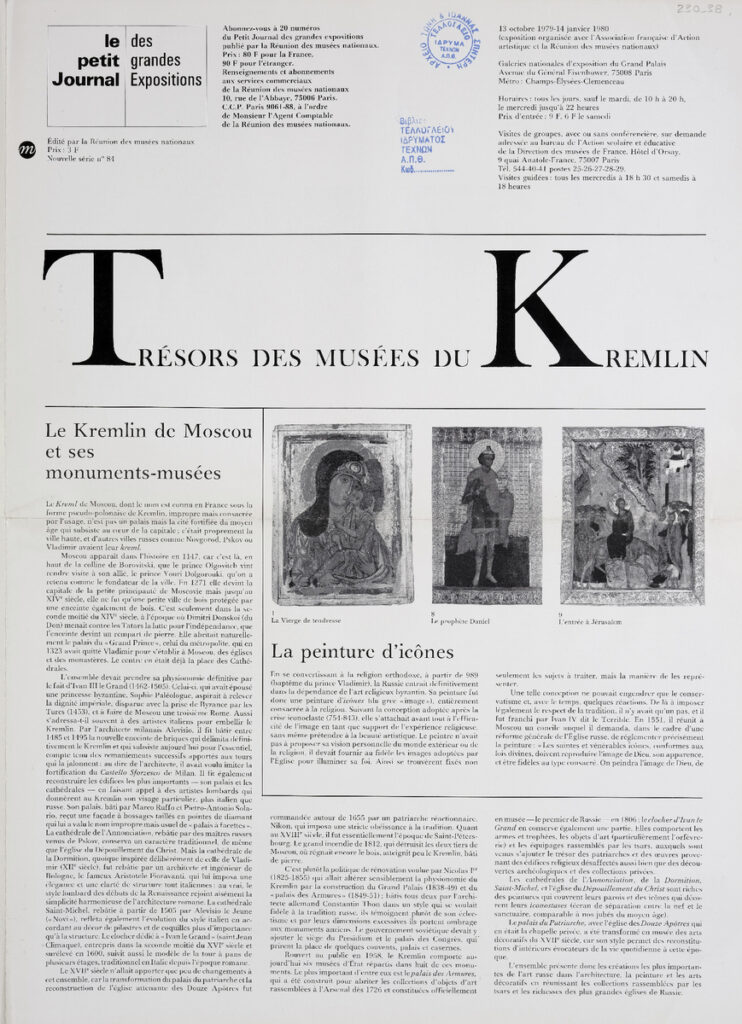 Έντυπο, στα γαλλικά, δίφυλλο (4 σελίδες), χαρτί, 46×33 εκ., αφιερωμένο σε έκθεση έργων τέχνης από τις συλλογές των Μουσείων του Κρεμλίνων, που πραγματοποιήθηκε στο Παρίσι το 1979.