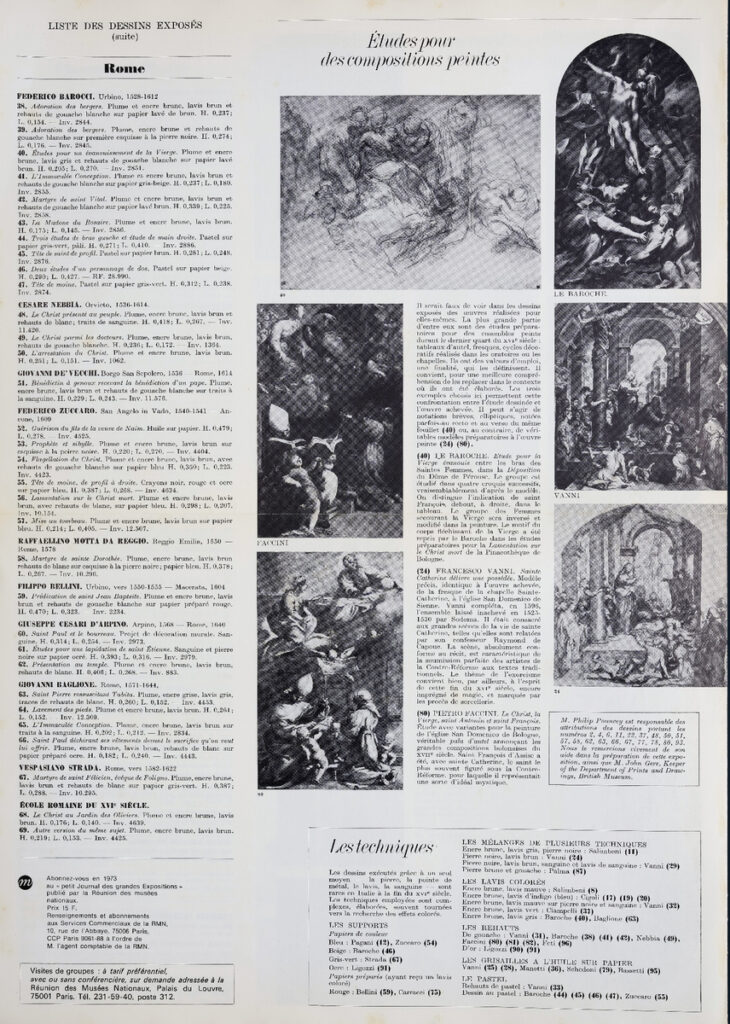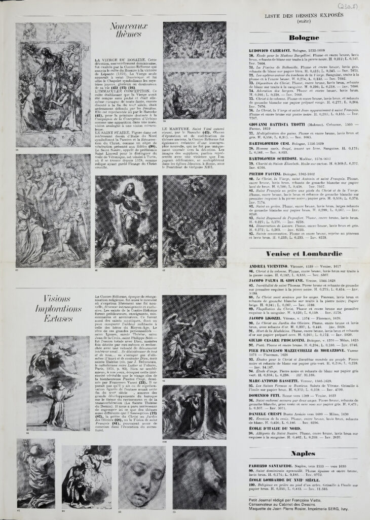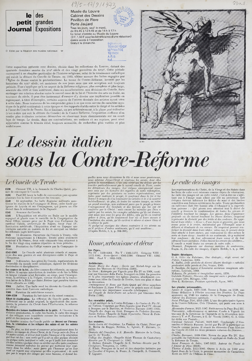 Έντυπο, στα γαλλικά, δίφυλλο (4 σελίδες), χαρτί ιλουστρασιόν, 44,5×32 εκ., αφιερωμένο στην θεματική έκθεση για το ιταλικό σχέδιο κατά την περίοδο της Αντιμεταρρύθμισης που πραγματοποιήθηκε στο Παρίσι το 1973. Στην πρώτη σελίδα, επιγραφή.
