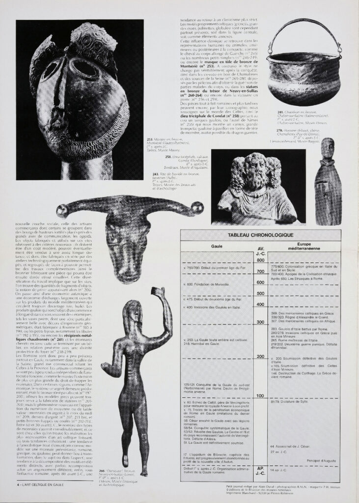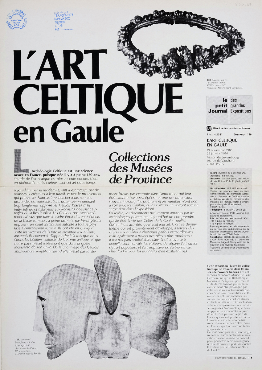 Έντυπο, στα γαλλικά, δίφυλλο (4 σελίδες), χαρτί, 44,5×32 εκ., έκθεσης έργων κέλτικης τέχνης από την περιοχή της Γαλατίας, που πραγματοποιήθηκε στο Παρίσι το 1984