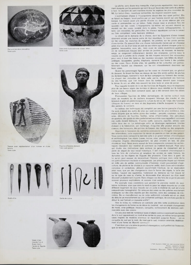 Έντυπο, στα γαλλικά, δίφυλλο (4 σελίδες), χαρτί ιλουστρασιόν, 44,5×32 εκ., αφιερωμένο στην θεματική έκθεση για την αρχαία αιγυπτιακή τέχνη.