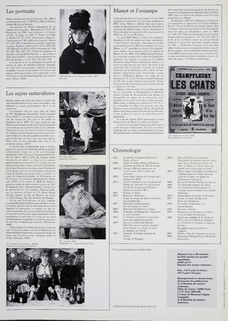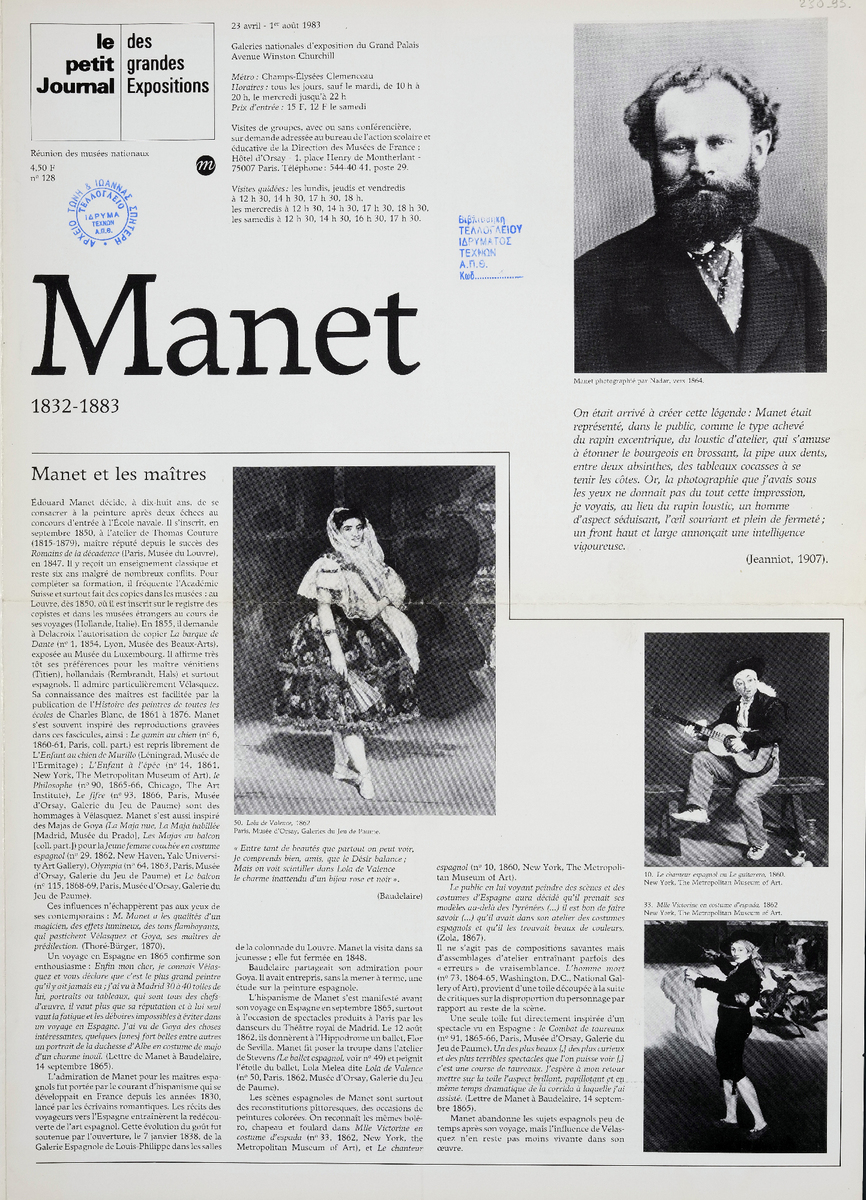 Έντυπο, στα γαλλικά, δίφυλλο (4 σελίδες), χαρτί ιλουστρασιόν, 44,5×32 εκ. έκθεσης αφιερωμένης στο έργο του Edouard Manet που διοργανώθηκε στο Παρίσι το 1983.
