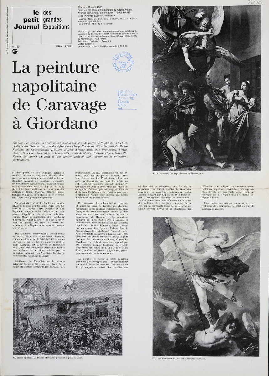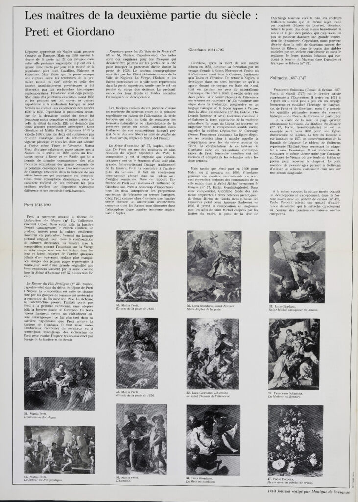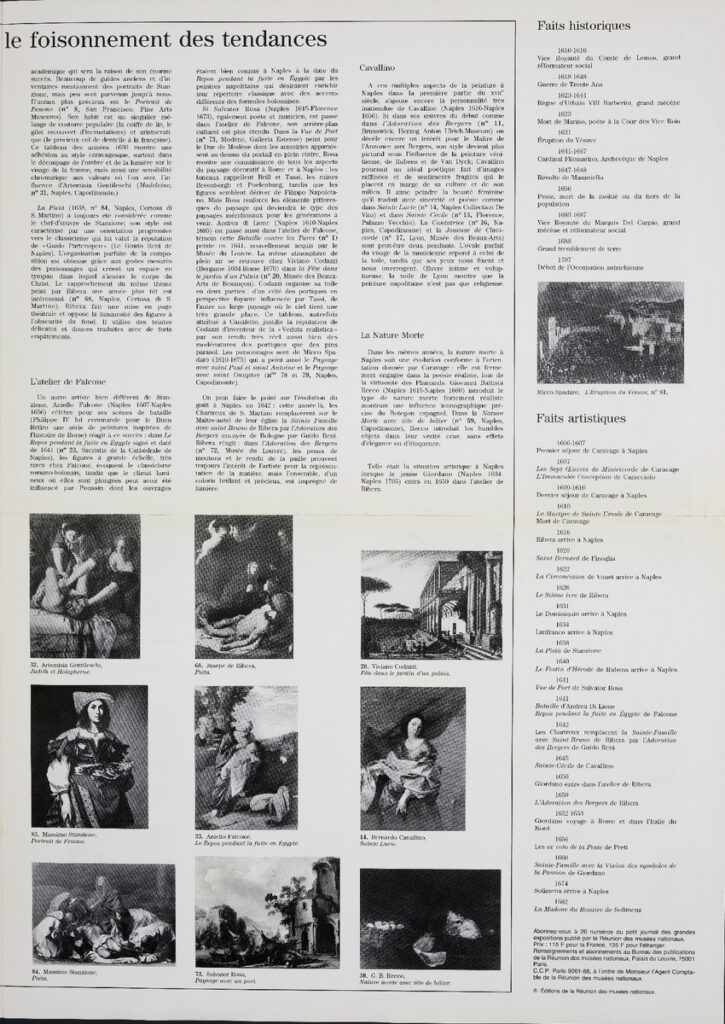 Έντυπο, στα γαλλικά, δίφυλλο (4 σελίδες), χαρτί ιλουστρασιόν, 44,5×32 εκ. έκθεσης αφιερωμένης στην τέχνη της Νάπολης κατά την περίοδο της Αναγέννησης, που διοργανώθηκε στο Παρίσι το 1983.