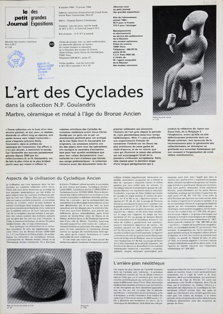 Έντυπο, στα γαλλικά, δίφυλλο (4 σελίδες), χαρτί ιλουστρασιόν, 44,5×32 εκ. έκθεσης κυκλαδικών αρχαιοτήτων από τη Συλλογή Ν.Π. Γουλανδρή, που διοργανώθηκε στο Παρίσι το 1983.