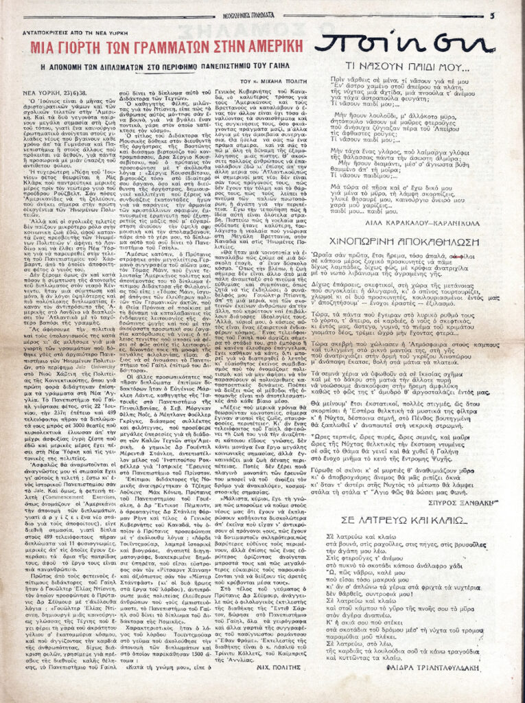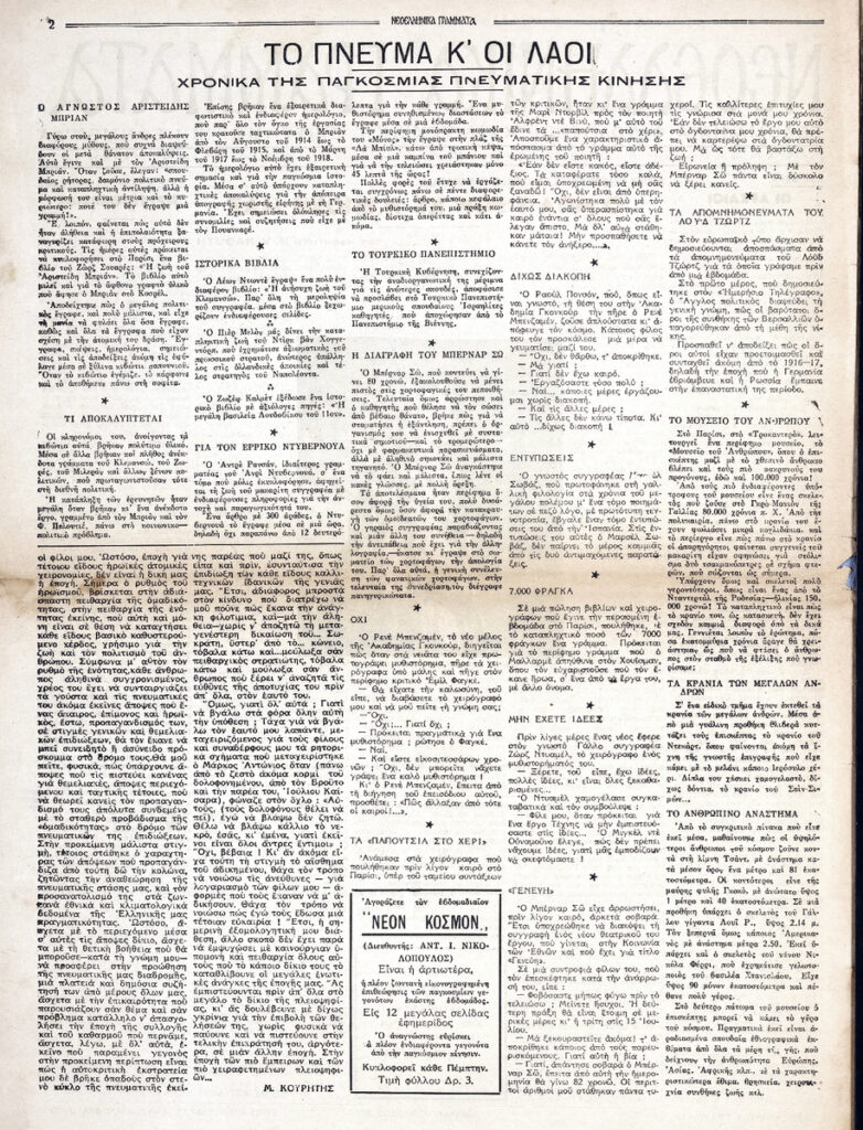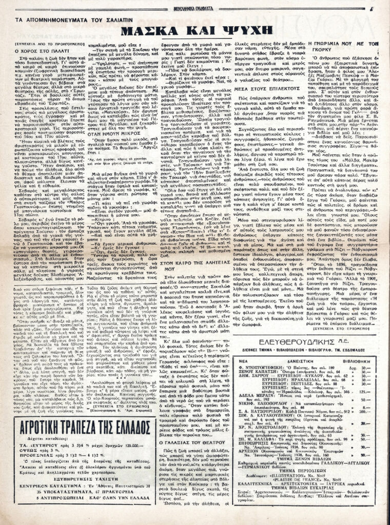 Φύλλο εφημερίδας, έντυπο, στα ελληνικά, 16 σσ. Δημοσιεύονται: Δημήτρης Φωτιάδης “Οι αρχαίοι”, H.V. Raouth “Ο Μπάυρον και η εποχή μας”, Μ. Κουρήτης “Περί πειθαρχίας”, “Το πνεύμα κ’οι λαοί. Χρονικά της παγκόσμιας πνευματικής κίνησης”, Γιώργος Θεοτοκάς “Απάντηση σ’ένα γράμμα για τον Υπερρεαλισμό”, “Μια συνέντευξη του Αντρέ Μωρουά”, “Υποψηφιότητες στην Ακαδημία Αθηνών. Γιατί όχι και ο κ. Θ. Τσούτσινος”, Ζαν Κασσού “Τα δίχως ηλικία παιδιά” (μτφρ. Γιάννης Ξυδιάς), Μιχαήλ Πολίτης “Μια γιορτή των γραμμάτων στην Αμερική. Η απονομή διπλωμάτων στο περίφημο πανεπιστήμιο του Γαίηλ”, Λίλα Καρακάλου-Καρανικόλα “Τι να’σουν παιδί μου”, Σπύρος Ξανθάκης “Χινοπωρινή αποκαθήλωση”, Φαίδρα Τριανταφυλλάκη “Σε λατρεύω και κλαίω…”, Λ. Πράσινος “Ο Σόμαλης”, “Τα απομνημονεύματα του Σαλιάπιν. Μάσκα και ψυχή”, Πωλ Βαλερύ-Ραντό “Κλωντ Ντεμπυσσύ”, Αθηνά Ταρσούλη “Το οδοιπορικό ελληνικό βιβλίο”, Ηλίας Ζιώγας “Καλλιτεχνικοί περίπατοι. Οι θησαυροί του Μουσείου Μπενάκη”, Σ. Κακούρης “Δράμα της Σαγκάης”, Ζ. Β. Πρίσλεϋ “Μέσα στη νύχτα” (μτφρ. Γεωργία Δεληγιάννη) • Ανταποκριτής “Η Ελληνική επαρχία”, Πάνος Λάγδας “Αλέκος Λιδωρίκης”, Δημοσθένης Βουτυράς “Το ρημαγμένο εργοστάσιο”, Γ. Μ. Μυλωνογιάννης “Το βιβλίο”, “Πνευματική και καλλιτεχνική κίνηση”, Zurgis Baltrusaitis “Η έκθεση των ιρανικών τεχνών στην Εθνική Βιβλιοθήκη του Παρισιού”, “Ο Δρ. Καρρέλ στην Ευρώπη”.