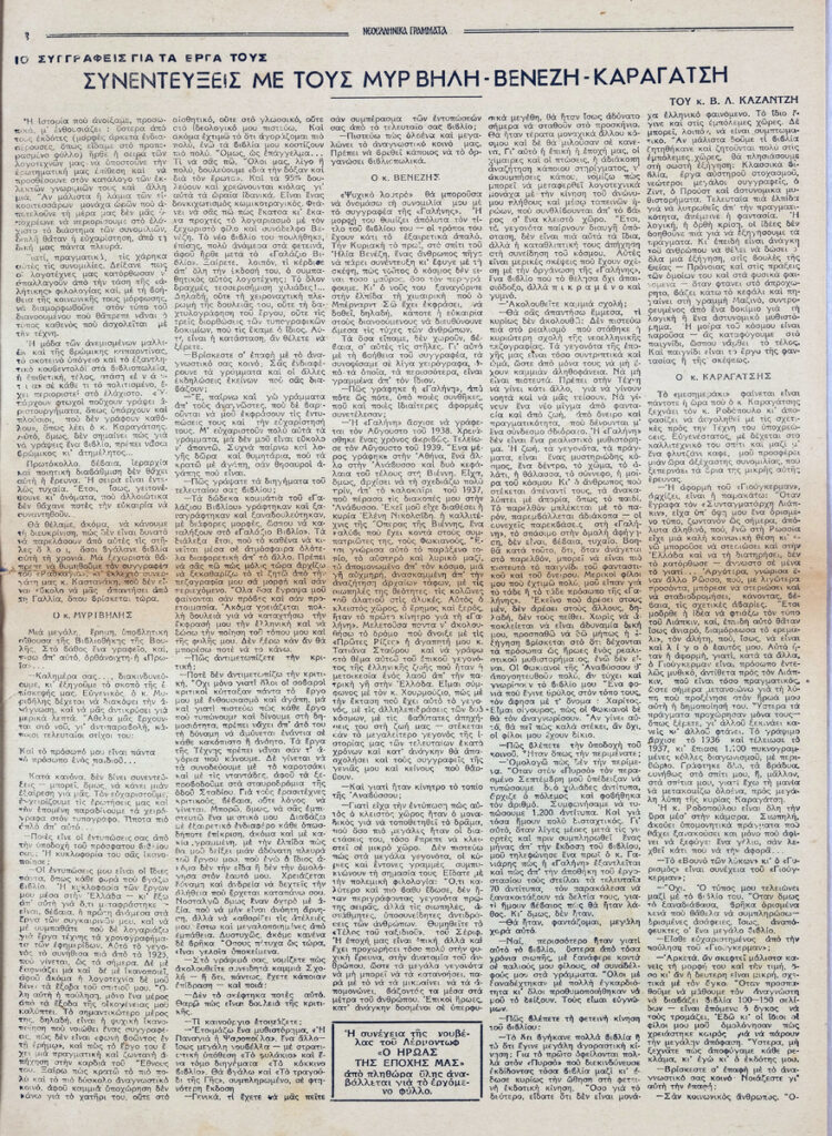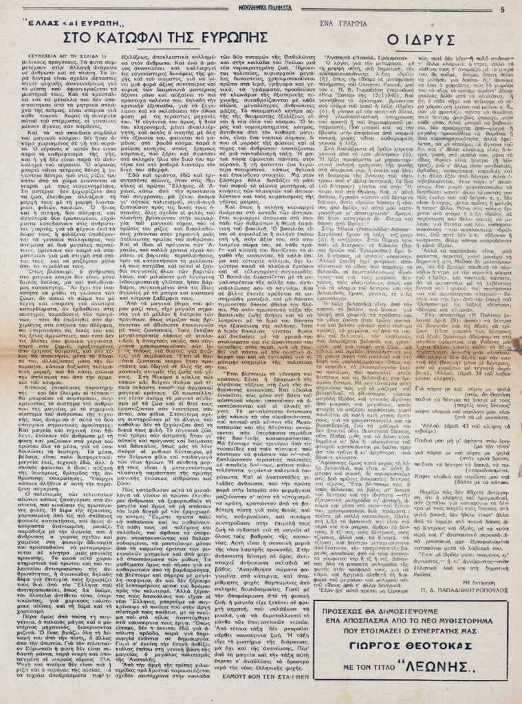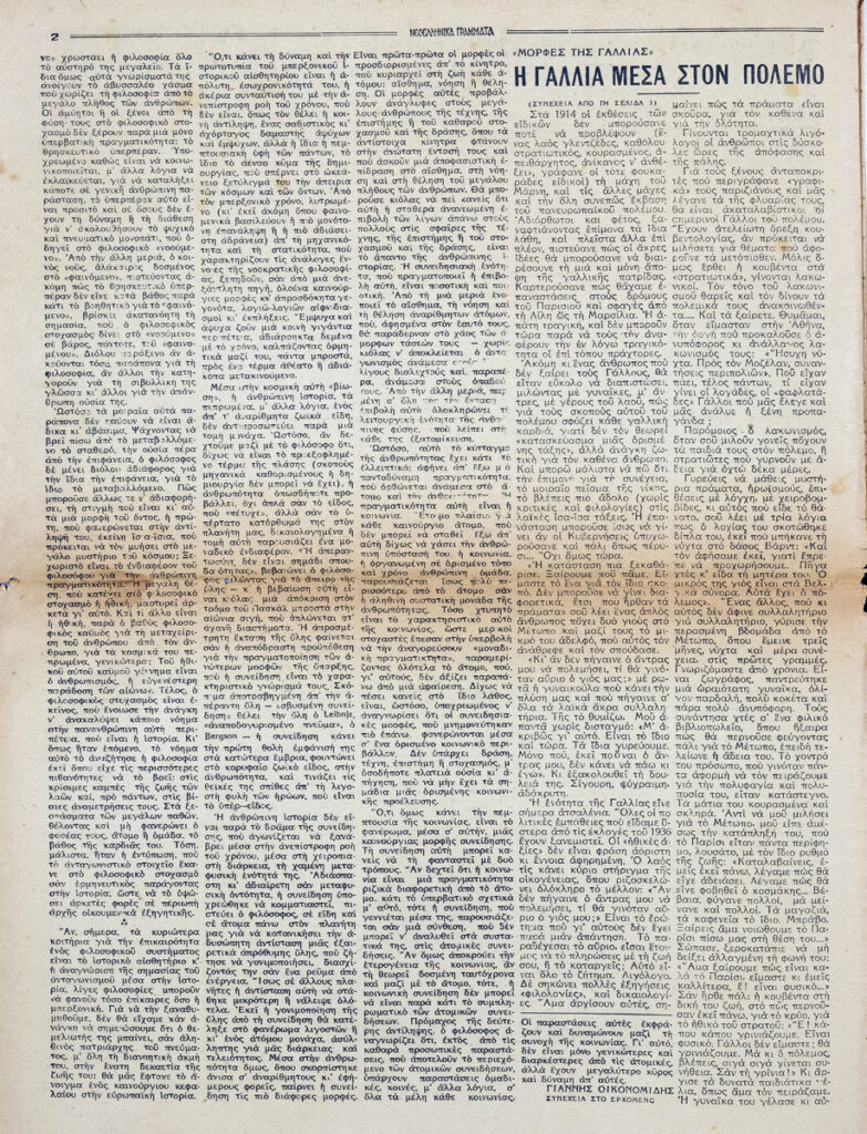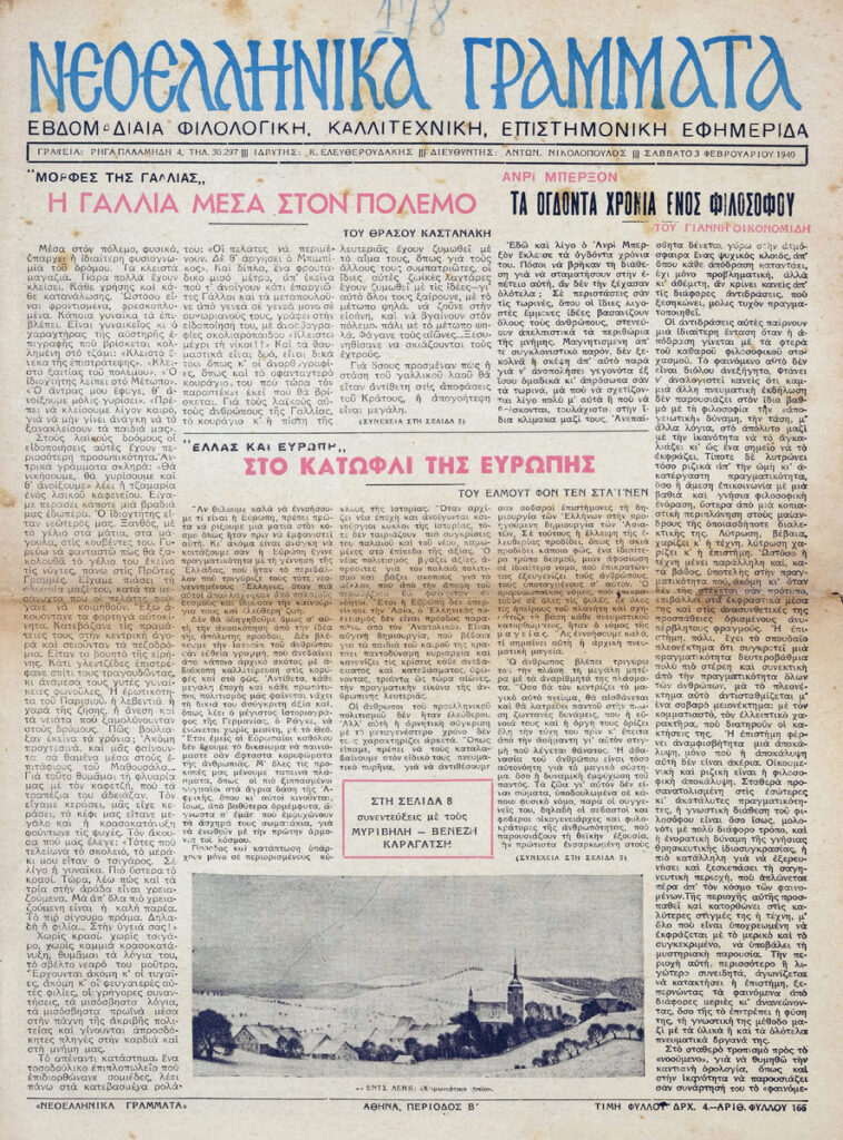 Φύλλο εφημερίδας, έντυπο, στα ελληνικά, 12 σσ. Δημοσιεύονται: Θράσος Καστανάκης “Μορφές της Γαλλίας – Η Γαλλία μέσα στον πόλεμο”, Γιάννη Οικονομίδη “Ανρί Μπερξόν – Τα ογδόντα χρόνια ενός φιλοσόφου”, Έλμουτ φον τεν Στάινεν “Ελλάς και Ευρώπη – Στο κατώφλι της Ευρώπης”, Γιάννης Κορδάτος “Η αρχαϊκή μορφή της οικογένειας” (μέρος Β’), Καρθαίος “Τα σημειώματα του παρατηρητή”, Άλντους Χάξλεϋ “Κοντραπούνκτο” (μτφρ. Σταύρος Στάγκος), Π. Δ. Παπαδημητρόπουλος “Ο Ίδρυς”, Σοφία Κ. Σπανούδη “Η μουσική ζωή – Μάριος Λάσκαρις”, Σωκράτης Καραντινός “Θ. Μουσατέσκου “Τιτάνικ Βαλς”, Φράνσι Κάρκο “Βερλαινικό”, Παναγή Λεκατσά “Ανάλεκτα”, Οδυσσέας Ελύτης “Ένα ανοιχτό γράμμα: Στον κ. Ε. Παπανούτσο”, Β.Λ. Καζαντζή “Συνεντεύξεις με τους Μυρβήλη-Βενέζη-Καραγάτση”, Γ. Κοτζιούλα “Περιδιαβάζοντας στο Άγιον Όρος”, Κούλη Ζαμπαθά “ανήμπορος στα Ψαροκάλυβα”, “Πνευματική και καλλιτεχνική κίνηση”, Σάρλ Μπωντλαίρ “Όπου νάναι εκτός του κόσμου (μτφρ. Ξενοφ. Καρακάλου), Μπερτράν ντε Ζουβενέλ ” Οι πολεμικοί σκοποί της Γερμανίας” (μτφρ. Ν. Ανδρ.). Στην πρώτη σελίδα, επιγραφή.