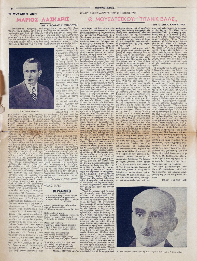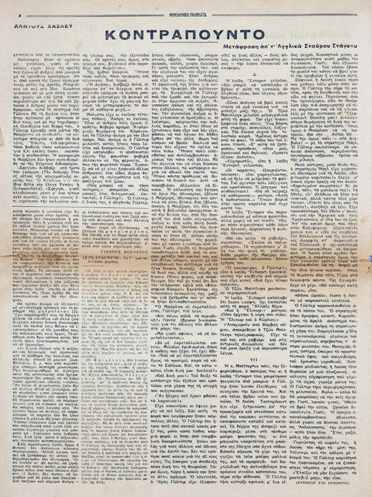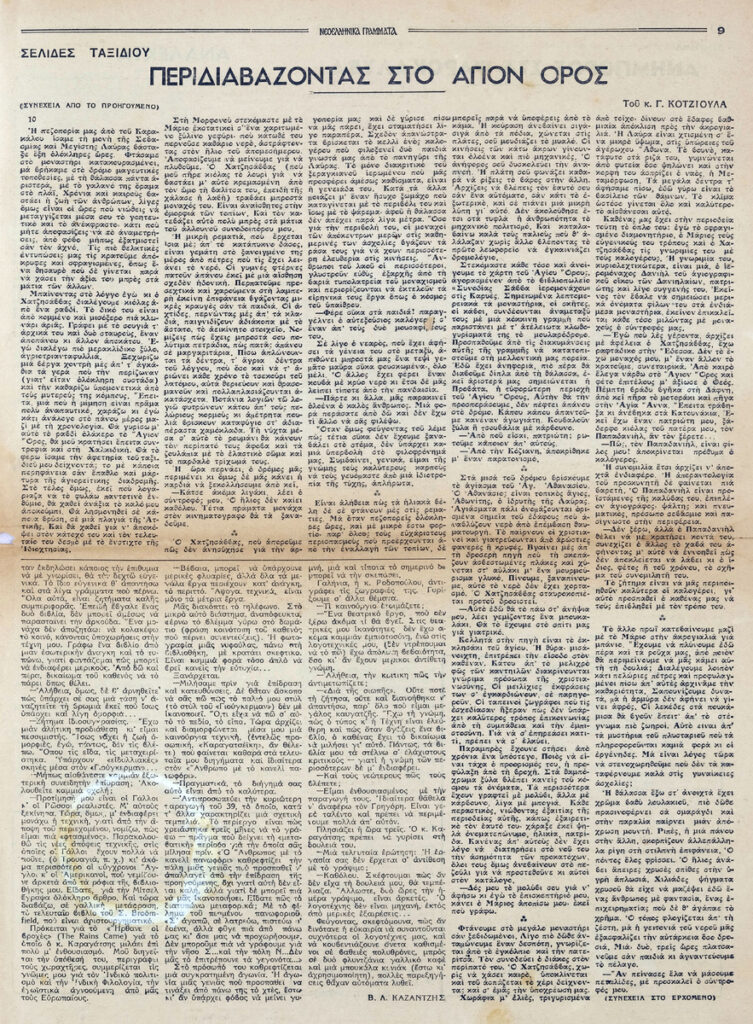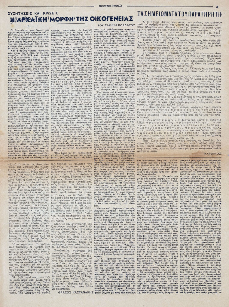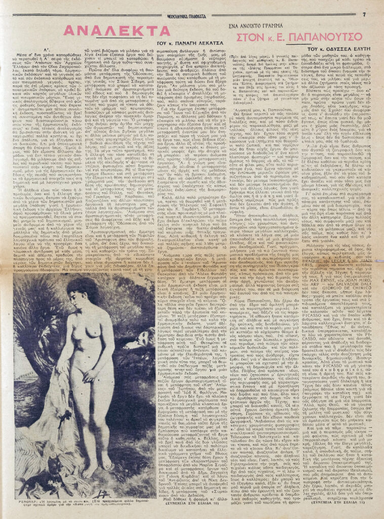 Φύλλο εφημερίδας, έντυπο, στα ελληνικά, 12 σσ. Δημοσιεύονται: Θράσος Καστανάκης “Μορφές της Γαλλίας – Η Γαλλία μέσα στον πόλεμο”, Γιάννη Οικονομίδη “Ανρί Μπερξόν – Τα ογδόντα χρόνια ενός φιλοσόφου”, Έλμουτ φον τεν Στάινεν “Ελλάς και Ευρώπη – Στο κατώφλι της Ευρώπης”, Γιάννης Κορδάτος “Η αρχαϊκή μορφή της οικογένειας” (μέρος Β’), Καρθαίος “Τα σημειώματα του παρατηρητή”, Άλντους Χάξλεϋ “Κοντραπούνκτο” (μτφρ. Σταύρος Στάγκος), Π. Δ. Παπαδημητρόπουλος “Ο Ίδρυς”, Σοφία Κ. Σπανούδη “Η μουσική ζωή – Μάριος Λάσκαρις”, Σωκράτης Καραντινός “Θ. Μουσατέσκου “Τιτάνικ Βαλς”, Φράνσι Κάρκο “Βερλαινικό”, Παναγή Λεκατσά “Ανάλεκτα”, Οδυσσέας Ελύτης “Ένα ανοιχτό γράμμα: Στον κ. Ε. Παπανούτσο”, Β.Λ. Καζαντζή “Συνεντεύξεις με τους Μυρβήλη-Βενέζη-Καραγάτση”, Γ. Κοτζιούλα “Περιδιαβάζοντας στο Άγιον Όρος”, Κούλη Ζαμπαθά “ανήμπορος στα Ψαροκάλυβα”, “Πνευματική και καλλιτεχνική κίνηση”, Σάρλ Μπωντλαίρ “Όπου νάναι εκτός του κόσμου (μτφρ. Ξενοφ. Καρακάλου), Μπερτράν ντε Ζουβενέλ ” Οι πολεμικοί σκοποί της Γερμανίας” (μτφρ. Ν. Ανδρ.). Στην πρώτη σελίδα, επιγραφή.