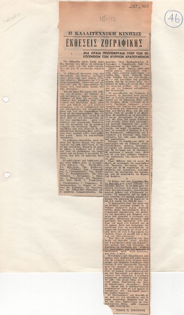 Απόκομμα, έντυπο, χαρτί, 33,0×10,2 εκ., όπου δημοσιεύεται, στα ελληνικά, άρθρο του Τώνη Σπητέρη με θέμα την πρωτοβουλία της «Ερανικής επιτροπής υπέρ των οικογενειών των Κυπρίων κρατουμένων» να διοργανώσει έκθεση με έργα ζωγραφικής, γλυπτική και χαρακτικής που θα χρησιμεύσουν ως λαχνοί σε λαχειοφόρο αγορά. Στο δεύτερο μέρος του άρθρου, κριτική για την πρώτη ατομική έκθεση του ζωγράφου Φώτου Φωτιάδη. Οι δύο εκθέσεις πραγματοποιήθηκαν στην Αθήνα το 1957. Εντάσσεται στη στήλη «Η καλλιτεχνική κίνησις». Επάνω, επιγραφή.