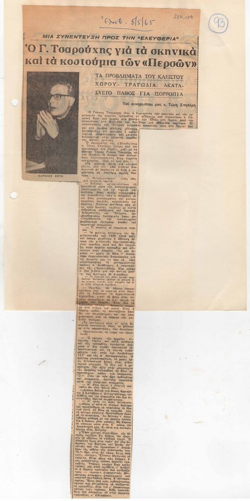 Απόκομμα, χαρτί ακανόνιστου μεγέθους επικολλημένο σε λευκή κόλλα 29×21 εκ., στα ελληνικά. Δημοσίευση συνέντευξης του Γιάννη Τσαρούχη στον Τώνη Σπητέρη, στην οποία αναφέρεται στα σκηνικά και κοστούμια της παράστασης ‘Πέρσες’ σε σκηνοθεσία Καρόλου Κουν.