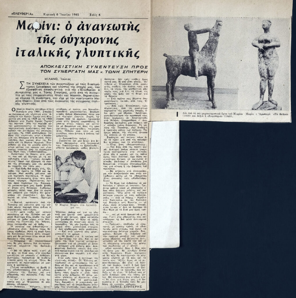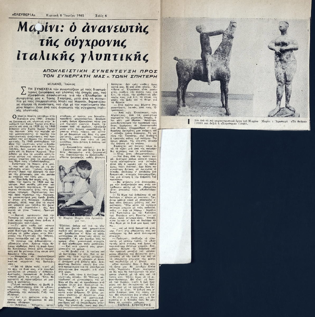 Απόκομμα, χαρτί ακανόνιστου μεγέθους επικολλημένο σε λευκή κόλλα, 29×21 εκ., στα ελληνικά. Δημοσίευση συνέντευξης του Marino Marini στον Τώνη Σπητέρη, στην οποία μιλά για το έργο του.