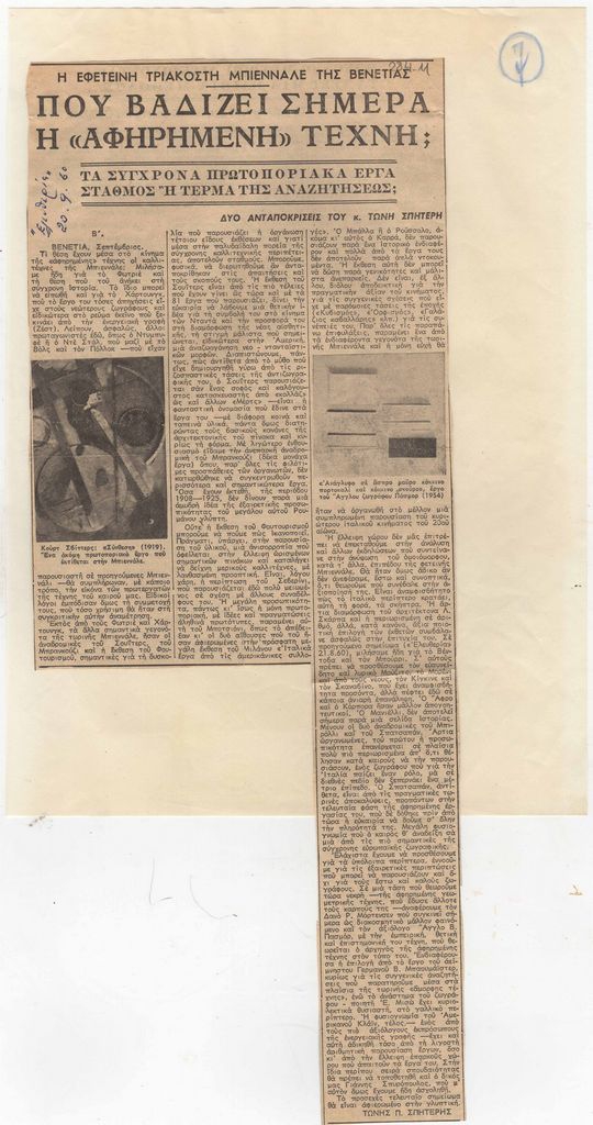 Απόκομμα, χαρτί ακανόνιστου μεγέθους, επικολλημένο σε λευκή κόλλα, 29×21 εκ., στα ελληνικά. Δημοσίευσης συνέχειας άρθρου- αφιερώματος του Τώνη Σπητέρη στην αφηρημένη τέχνη, με αφορμή την παρουσίαση παρόμοιων έργων στην Μπιεννάλε Βενετίας 1960.