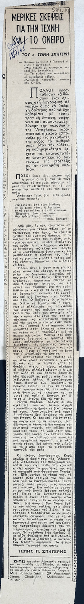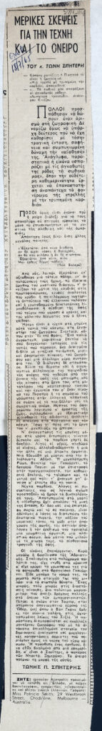 Απόκομμα, χαρτί, 48×6 εκ., επικολλημένο σε λευκή κόλλα 30×21 εκ., στα ελληνικά. Δημοσίευση άρθρου του Τώνη Σπητέρη στο οποίο εκφράζει τις σκέψεις του για την τέχνη.