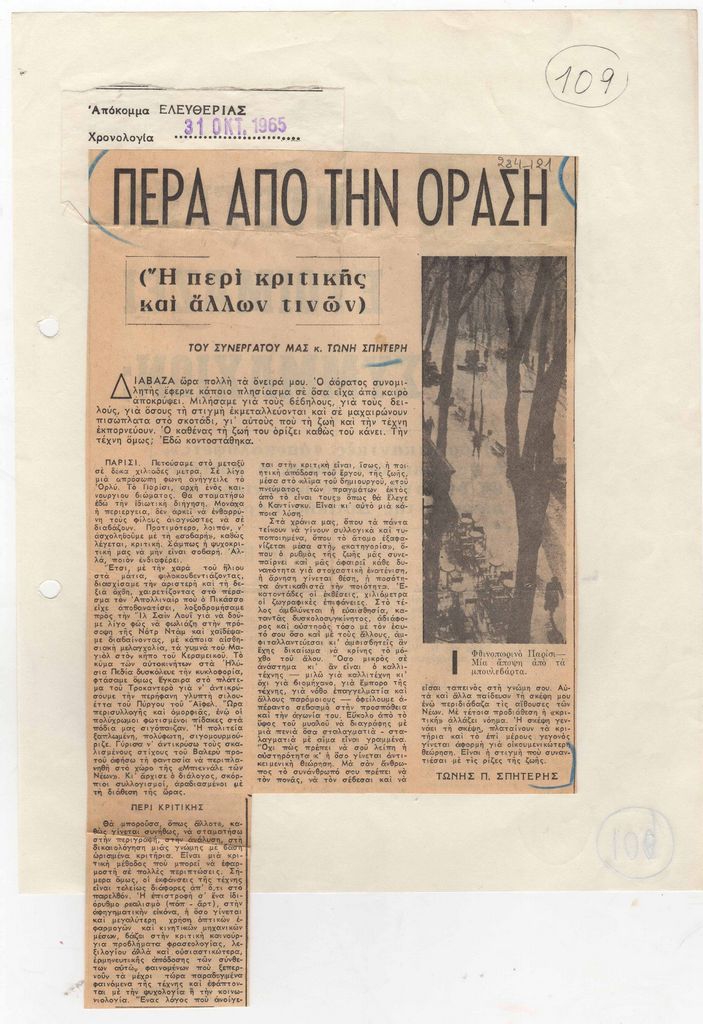 Απόκομμα, χαρτί ακανόνιστου μεγέθους, επικολλημένο σε λευκή κόλλα, 29×21 εκ., στα ελληνικά. Δημοσίευση άρθρου του Τώνη Σπητέρη, στο οποίο αναφέρεται σε ζητήματα κριτικής της τέχνης.