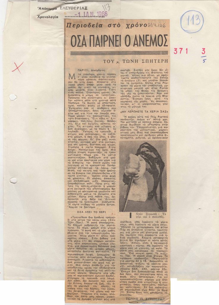 Απόκομμα, χαρτί, 27×10 εκ., επικολλημένο σε λευκή κόλλα, 28×21 εκ., στα ελληνικά. Δημοσίευση του Τώνη Σπητέρη κριτικής έκθεσης με θέμα το ανθρώπινο χέρι, η οποία διεξάγεται στο Παρίσι.