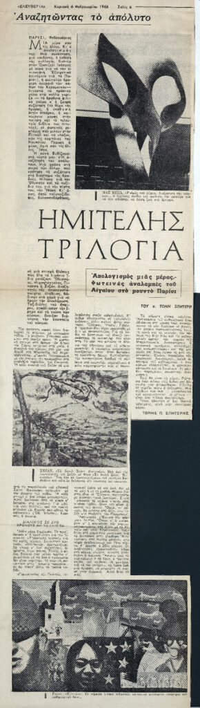 Απόκομμα, χαρτί ακανόνιστου μεγέθους επικολλημένο σε λευκή κόλλα 29×21 εκ., στα ελληνικά. Δημοσίευση άρθρου του Τώνη Σπητέρη, στο οποίο μεταφέρει σκέψεις του για την Τέχνη, με αφορμή έκθεση έργων της συλλογής Walter, στην Orangerie στο Παρίσι.