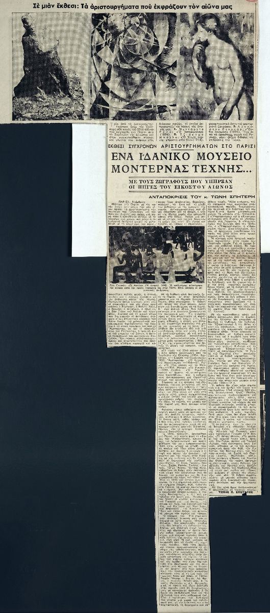 Απόκομμα, χαρτί ακανόνιστου μεγέθους επικολλημένο σε λευκή κόλλα, 29×21 εκ., στα ελληνικά. Δημοσίευση άρθρου του Τώνη Σπητέρη, στο οποίο μεταφέρει εντυπώσεις και σκέψεις του από την επίσκεψή του σε έκθεση “Οι πηγές του 20ου αιώνα”, που πραγματοποιείται στο Μουσείο Σύγχρονης Τέχνης του Παρισιού.