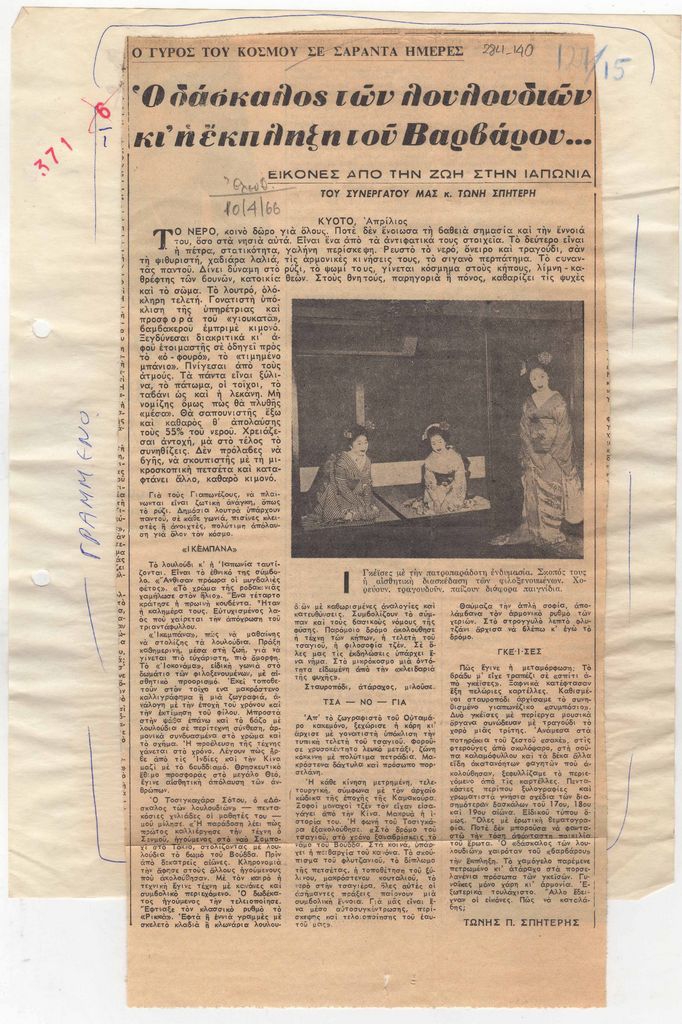 Απόκομμα, χαρτί, 32×15.5 εκ., επικολλημένο σε λευκή κόλλα, 28×21 εκ., στα ελληνικά. Δημοσίευση άρθρου του Τώνη Σπητέρη, στο οποίο μεταφέρει εντυπώσεις του από ταξίδι του στην Ιαπωνία.