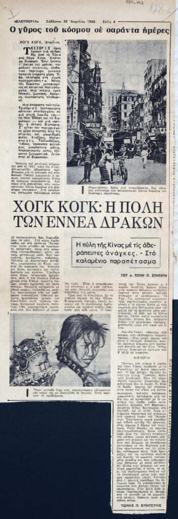 Απόκομμα, χαρτί ακανόνιστου μεγέθους, επικολλημένο σε λευκή κόλλα, 28×21 εκ., στα ελληνικά. Δημοσίευση άρθρου του Τώνη Σπητέρη στο οποίο μεταφέρει εντυπώσεις από ταξίδι του στο Χογκ Κογκ.