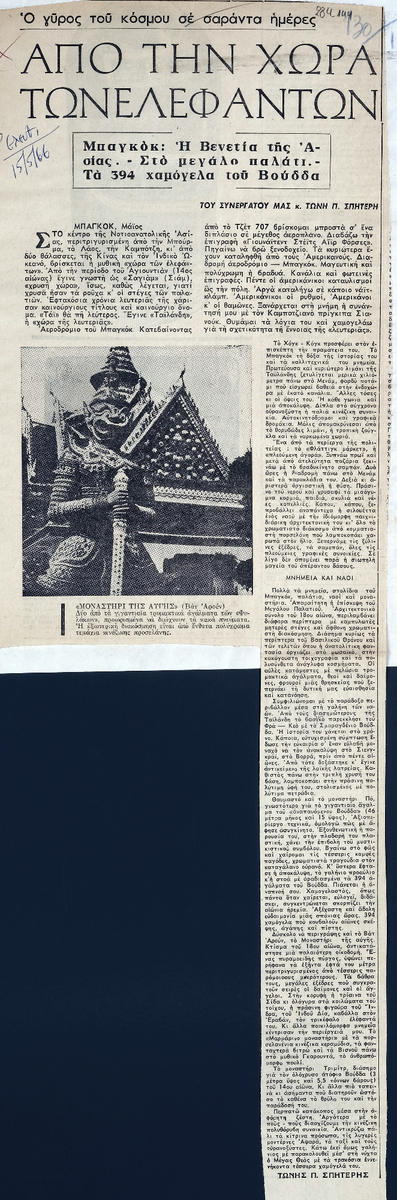 Απόκομμα, χαρτί ακανόνιστου μεγέθους, επικολλημένο σε λευκή κόλλα, στα ελληνικά. Δημοσίευση άρθρου του Τώνη Σπητέρη στο οποίο μεταφέρει εντυπώσεις του από επίσκεψή του στην Μπαγκόκ.