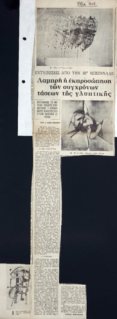 Απόκομμα, χαρτί ακανόνιστου μεγέθους, επικολλημένο σε λευκή κόλλα, 28×21 εκ., στα ελληνικά. Δημοσίευση άρθρου του Τώνη Σπητέρη, στο οποίο αναφέρεται σε έργα γλυπτικής, τα οποία παρουσιάζονται στην 33η Μπιεννάλε Βενετίας 1966.