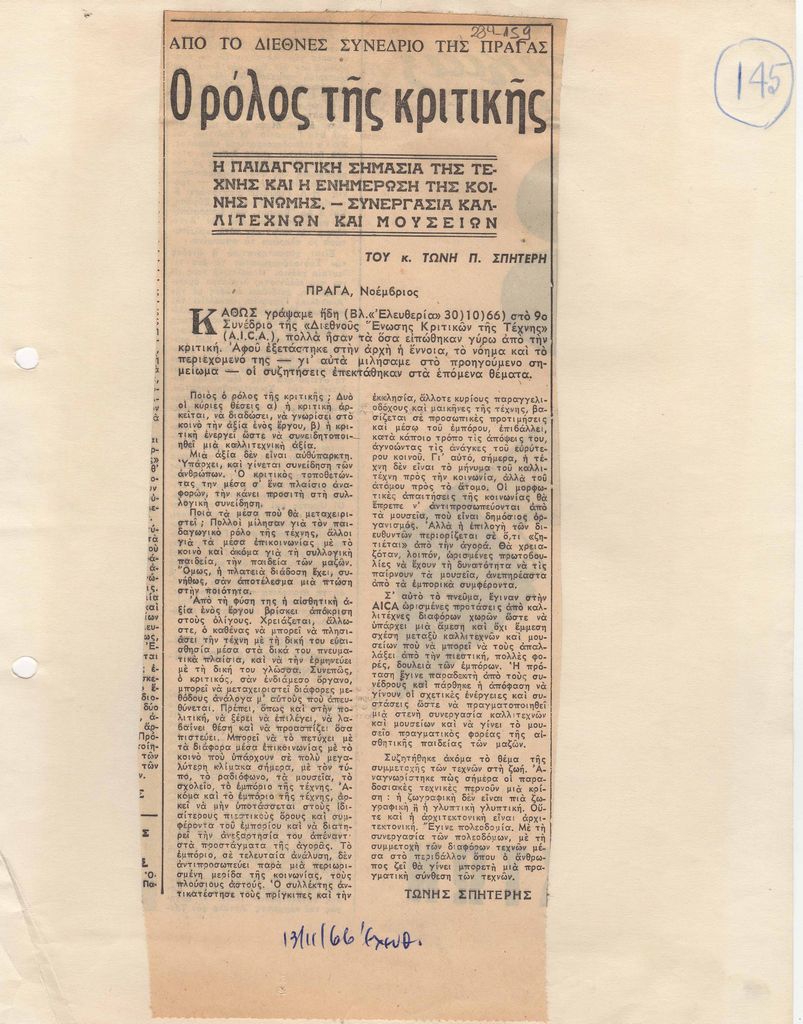 Απόκομμα, χαρτί, 26×10.5 εκ., επικολλημένο σε λευκή κόλλα, 28×21 εκ., στα ελληνικά. Δημοσίευση άρθρου του Τώνη Σπητέρη στο οποίο αναφέρεται στο ρόλο της κριτικής της τέχνη, με αφορμή τις εργασίες του 9ου διεθνούς συνεδρίου της AICA, που παρακολούθησε και συμμετείχε στην Πράγα.