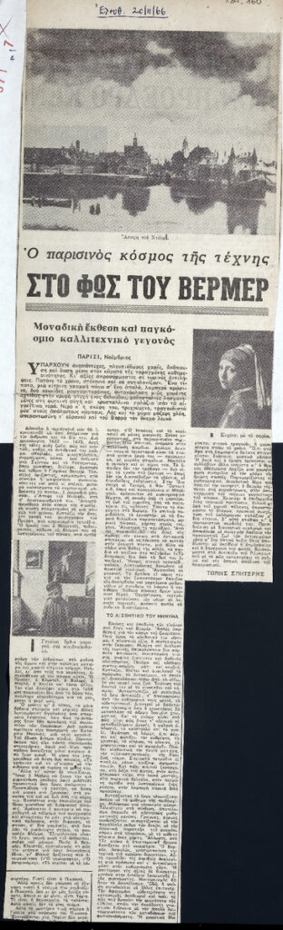 Απόκομμα, χαρτί ακανόνιστου μεγέθους επικολλημένο σε λευκή κόλλα, 28×21 εκ., στα ελληνικά. Δημοσίευση κριτικής του Τώνη Σπητέρη, έκθεσης Johannes Vermeer, η οποία διεξάγεται στην Orangerie στο Παρίσι. Αναγράφονται λεπτομέρειες για το περιεχόμενό της και σχόλια για τη ζωγραφική του.