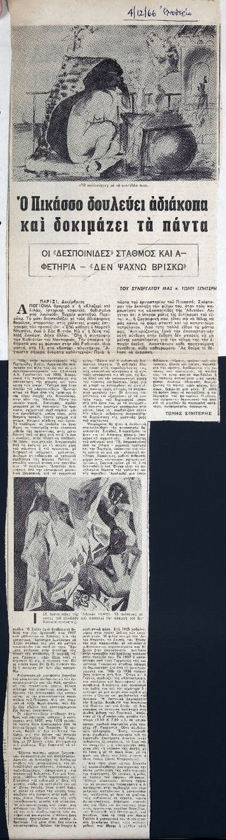 Απόκομμα, χαρτί ακανόνιστου μεγέθους επικολλημένο σε λευκή κόλλα, 28×21 εκ., στα ελληνικά. Δημοσίευση άρθρου του Τώνη Σπητέρη, στο οποίο αναφέρεται στη ζωγραφική του Pablo Picasso.