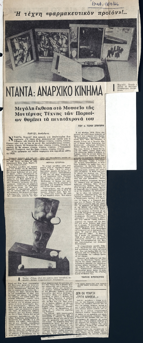 Απόκομμα, χαρτί ακανόνιστου μεγέθους, επικολλημένο σε λευκή κόλλα, 28×21 εκ., στα ελληνικά. Δημοσίευση άρθρου του Τώνη Σπητέρη, στο οποίο αναφέρεται στο κίνημα του Dada (ντανταϊσμού), με αφορμή έκθεση στο μουσείο μοντέρνας τέχνης του Παρισιού.