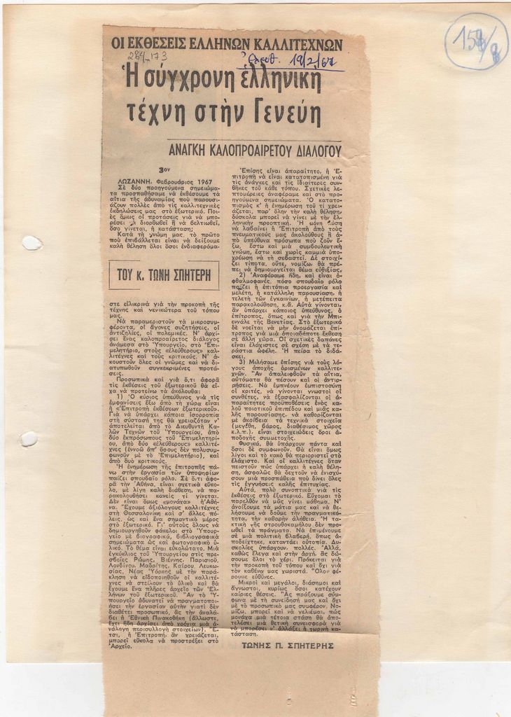 Απόκομμα, χαρτί, 28×11 εκ., στα ελληνικά, δημοσίευσης συνέχειας άρθρου το οποίο αναφέρεται στη διοργάνωση εκθέσεων νεοελληνικής τέχνης στο εξωτερικό. Αναγράφονται λεπτομέρειες σχετικά με την επιλογή των καλλιτεχνών, τις επιτροπές που συμμετέχουν, με αφορμή την διοργάνωση έκθεσης νεοελληνικής τέχνης στην Γενεύη.