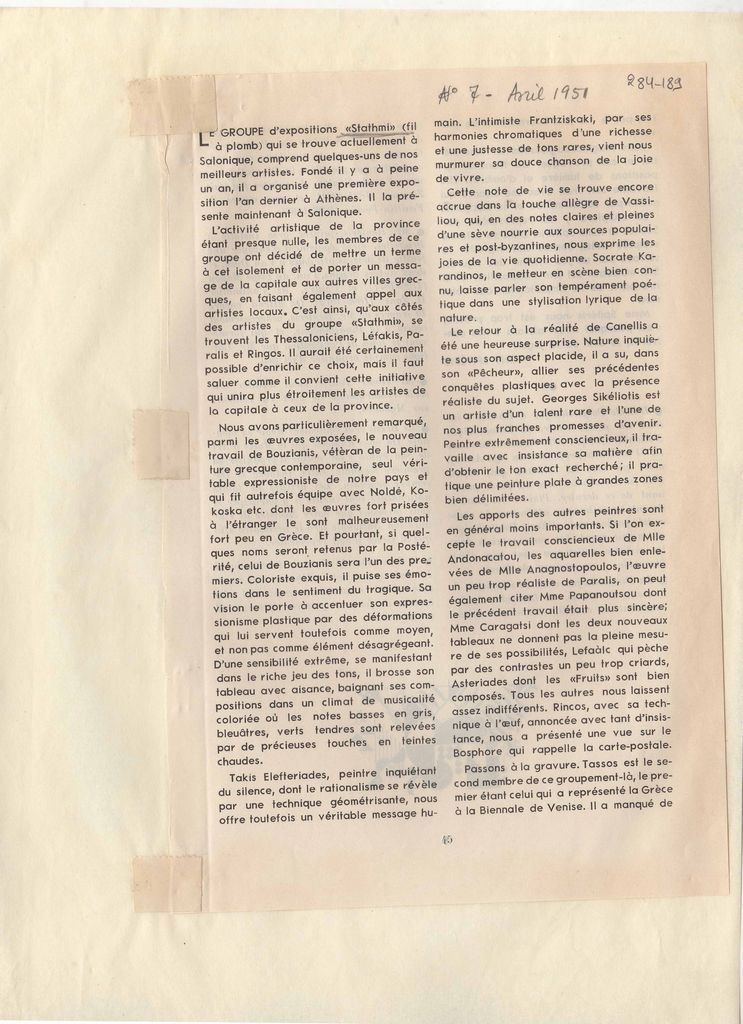 Απόκομμα, χαρτί, 23×15 εκ., επικολλημένο σε λευκή κόλλα, 28×21 εκ., στα γαλλικά. Δημοσίευση άρθρου του Τώνη Σπητέρη, στο οποίο αναφέρεται σε εικαστικά της περιόδου. Ανάμεσα σε αυτά, έκθεση της ομάδας ‘Στάθμη’, εκθέσεις- καινούρια έργα των Γ. Μπουζιάνη, Τ. Ελευθεριάδη, Σ. Βασιλείου, Ο. Κανέλλη, Γ. Σικελιώτη, Ν. Αντωνακάτου, Τάσσου, Σώχου, Ι. Βεροπούλου. Στο ίδιο απόκομμα, γίνεται αναφορά σε έργα που προστίθενται στη συλλογή της Εθνικής Πινακοθήκης, σε εκδόσεις βιβλίων τέχνης και σε εικαστικά νέα της περιόδου.