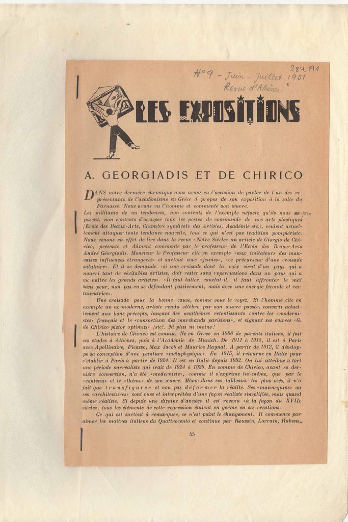 Απόκομμα, χαρτί διπλής όψης, 22.5×15 εκ., συρραμμένο σε λευκή κόλλα 28×21 εκ., στα γαλλικά. Αναδημοσίευση άρθρου του Albert Savarus για τον Giorgio de Chirico, ενσωματωμένο σε άρθρο του Τώνη Σπητέρη για τον καλλιτέχνη. Δίνονται βιογραφικά και σχολιάζεται το εικαστικό του έργο. Στο ίδιο απόκομμα, αναφορά σε εκθέσεις και σε εικαστικά δρώμενα της περιόδου.