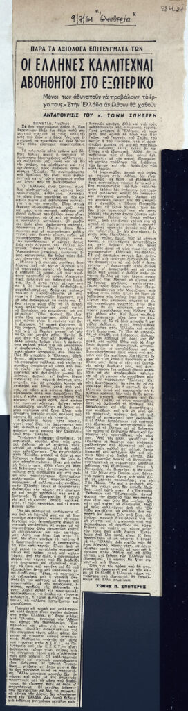 Απόκομμα, χαρτί ακανόνιστου μεγέθους, επικολλημένο σε λευκή κόλλα, 29×21 εκ., στα ελληνικά. Δημοσίευση άρθρου του Τώνη Σπητέρη στο οποίο αναφέρεται σε προβλήματα που αντιμετωπίζουν οι Έλληνες καλλιτέχνες που δραστηριοποιούνται στο εξωτερικό, εξαιτίας της αδράνειας που κυριαρχεί στο πολιτιστικό γίγνεσθαι της Ελλάδας.