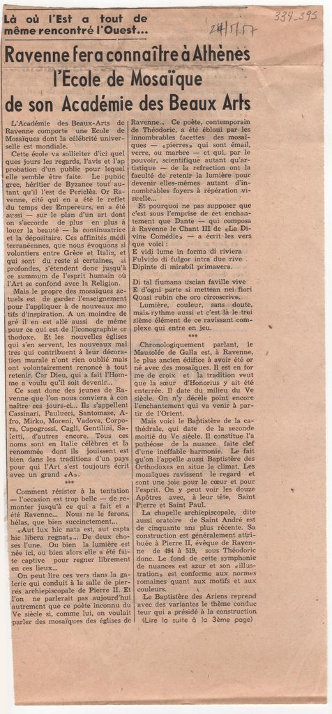 Απόκομμα, έντυπο, στα γαλλικά, χαρτί, διπλής όψης. Πάνω από τον τίτλο, επιγραφή με στοιχεία της έκδοσης.
