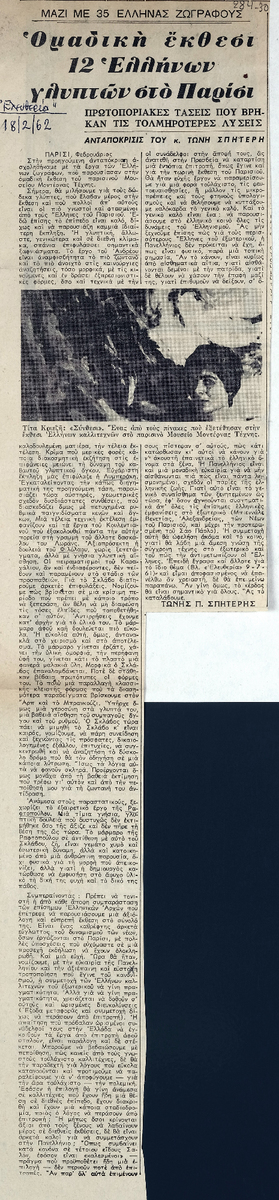 Απόκομμα, χαρτί ακανόνιστου μεγέθους, επικολλημένο σε λευκή κόλλα, 29×21 εκ., στα ελληνικά. Δημοσίευση κριτικής του Τώνη Σπητέρη, στην οποία σχολιάζει τις συμμετοχές γλυπτών σε ομαδική έκθεση νεοελληνικής τέχνης, η οποία διεξάγεται στο Μουσείο Μοντέρνας Τέχνης του Παρισιού.