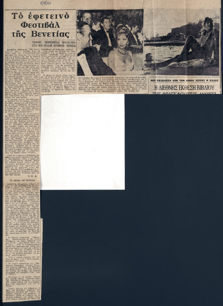 Απόκομμα, χαρτί ακανόνιστου μεγέθους, επικολλημένο σε λευκή κόλλα, 29×21 εκ., στα ελληνικά. Δημοσίευση άρθρου του Τώνη Σπητέρη στο οποίο μεταφέρει εντυπώσεις από το 23ο Φεστιβάλ Κινηματογράφου της Βενετίας. Αναφέρεται σε προβολές ταινιών, ηθοποιούς που βρέθηκαν εκεί και στη διοργάνωση.