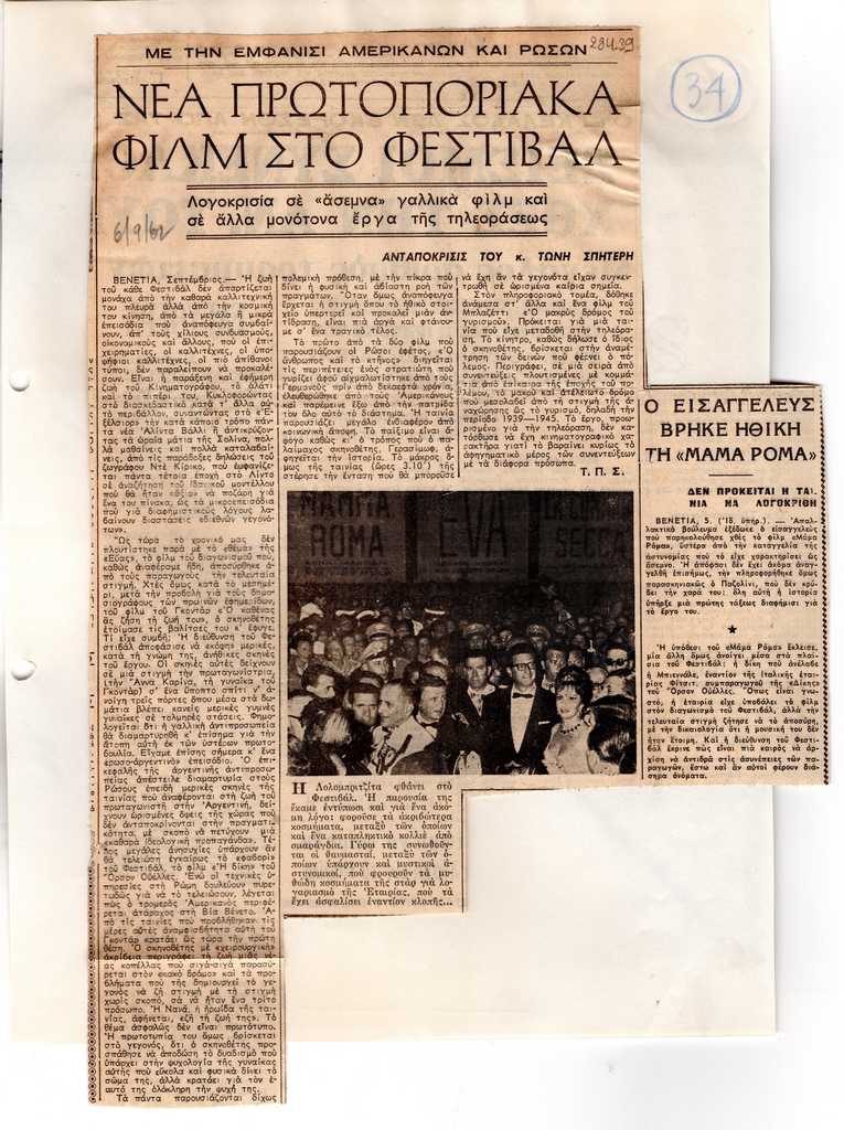 Απόκομμα, χαρτί ακανόνιστου μεγέθους, επικολλημένο σε λευκή κόλλα, 29×21 εκ., στα ελληνικά. Δημοσίευση άρθρου του Τώνη Σπητέρη στο οποίο αναφέρεται σε προβολές γαλλικών φιλμ στο 23ο Φεστιβάλ Κινηματογράφου της Βενετίας.