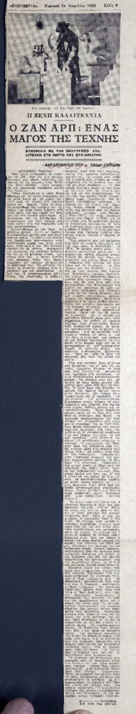 Απόκομμα, χαρτί, 2 φφ ακανόνιστου μεγέθους, επικολλημένα σε λευκή κόλλα, 29×21 εκ., στα ελληνικά. Δημοσίευση άρθρου του Τώνη Σπητέρη, στο οποίο αφηγείται τις εντυπώσεις που αποκόμισε από συνάντηση και γνωριμία του με τον Jean Arp.
