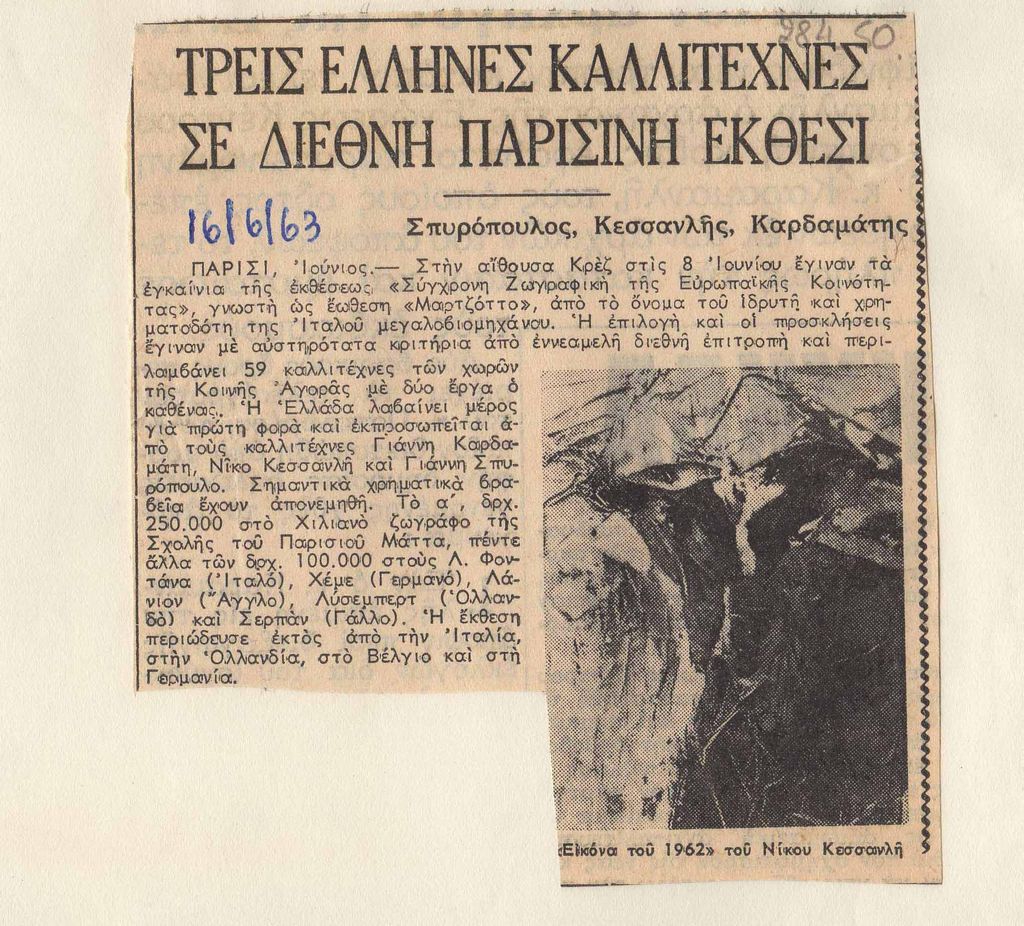Απόκομμα, χαρτί επικολλημένο σε λευκή κόλλα, 29×21 εκ., στα ελληνικά. Δημοσίευση άρθρου του Τώνη Σπητέρη, το οποίο αναφέρεται σε έκθεση ζωγραφικής στο Παρίσι, στην οποία μεταξύ άλλων συμμετέχουν οι Ν. Κεσσανλής, Γ. Σπυρόπολος και Γ. Καρδαμάτης. Γίνεται αναφορά στα βραβεία που απονεμήθησαν και σε πόλεις όπου περιόδευσε η έκθεση.