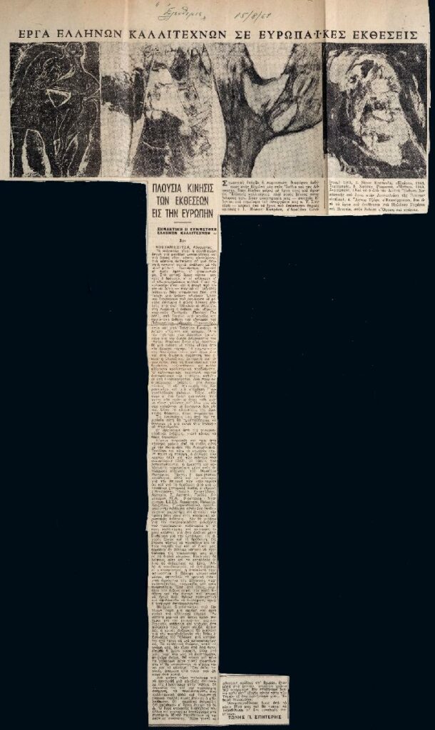Απόκομμα εφημερίδας, χαρτί, στα ελληνικά. Δημοσίευση άρθρου του Τώνη Σπητέρη στο οποίο αναφέρεται σε εκθέσεις που πραγματοποιήθηκαν σε ευρωπαϊκές πόλεις το καλοκαίρι του 1963, στις οποίες συμμετείχαν με έργα τους Έλληνες καλλιτέχνες. Αναφέρεται σε έκθεση λαϊκής ζωγραφικής στο Εθνολογικό Μουσείο Λωζάνης, Έκθεση ‘Πρωτοποριακών Γκαλερί’ στην γκαλερί Πιλότ, Έκθεση Μπαρόκ στο Πιενμόντε, έκθεση στο Palazzo Grassi και εκθέσεις στη Γιουγκοσλαβία: Μπιεννάλε χαρακτικής, έκθεση γιουγκοσλάβικων εικόνων, συμπόσιο ‘Forma Viva’. Αναφέρεται ειδικότερα στην Μπιεννάλε χαρακτικής της Λιουμπλιάνα.