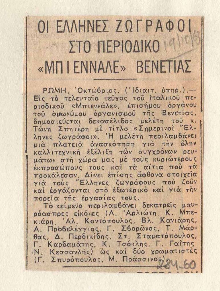 Απόκομμα, χαρτί, 7.5×5 εκ., επικολλημένο σε λευκή κόλλα 29×21 εκ., στα ελληνικά. Δημοσίευση άρθρου του Τώνη Σπητέρη στο οποίο αναφέρεται σε κυκλοφορία περιοδικού της Μπιεννάλε Βενετίας 1963, στο οποίο εμπεριέχεται μελέτη του Τ. Σπητέρη για Έλληνες ζωγράφους. Ειδικότερα, αναφέρεται στους Λ. Αρλιώτη, Κ. Μπεκιάρη, Α. Κοντόπουλο, Β. Κανιάρη, Α. Προβελέγγιο, Γ. Σβορώνο, Τ. Μάρθα, Δ. Περδικίδη, Σ. Σταματόπουλο, Γ. Καρδαμάτη, Κ. Τσόκλη, Γ. Γαΐτη, Ν. Κεσσανλή, Γ. Σπυρόπουλο και Μ. Πράσινο.