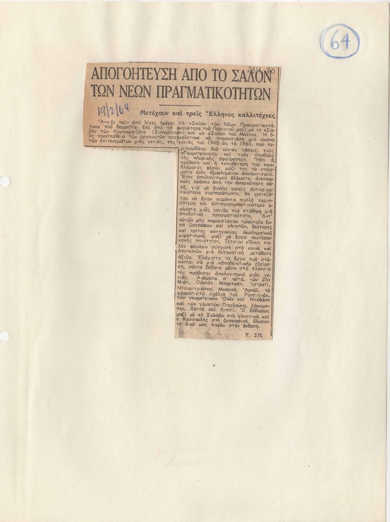 Απόκομμα, χαρτί επικολλημένο σε λευκή κόλλα, 29×21 εκ., στα ελληνικά. Δημοσίευση άρθρου του Τώνη Σπητέρη, το οποίο αναφέρεται στο “Salon des Réalités Nouvelles” του 1964.