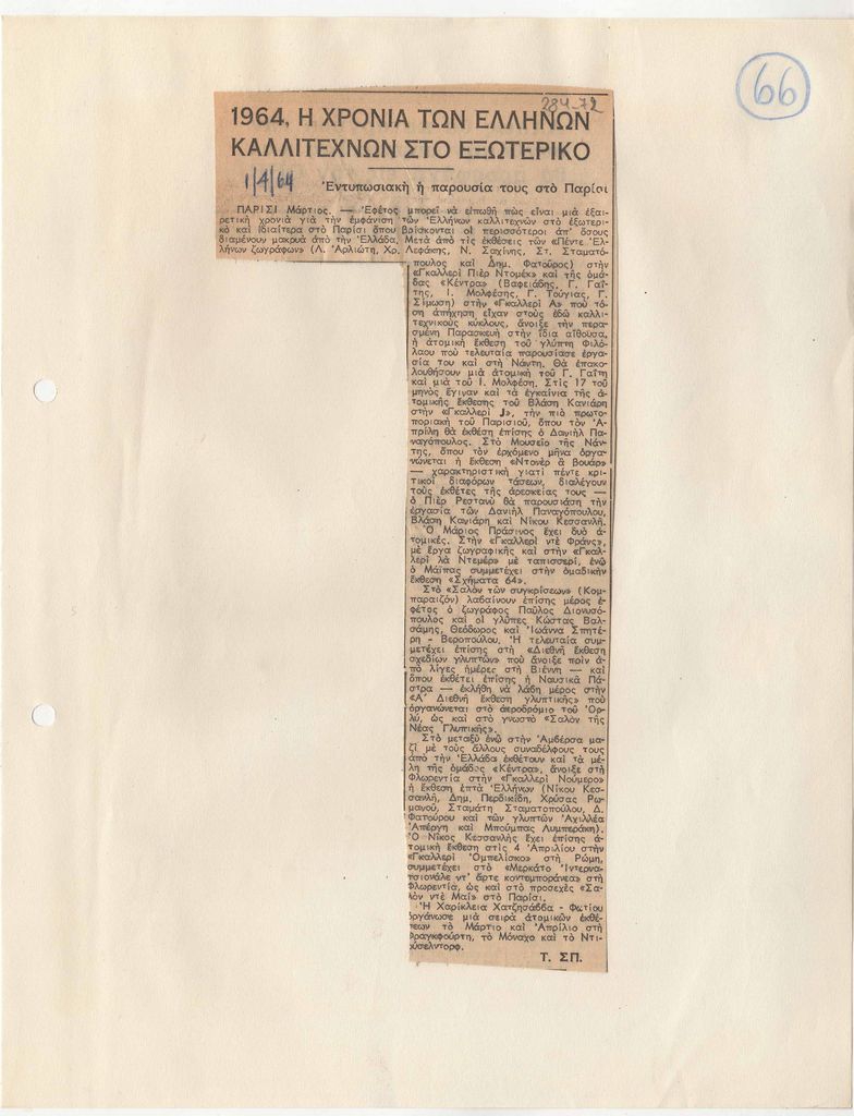 Απόκομμα, χαρτί επικολλημένο σε λευκή κόλλα, 29×21 εκ., στα ελληνικά. Δημοσίευση άρθρου του Τώνη Σπητέρη, στο οποίο αναφέρεται σε εκθέσεις Ελλήνων καλλιτεχνών και συμμετοχές τους σε διεθνείς διοργανώσεις κατά το 1964.