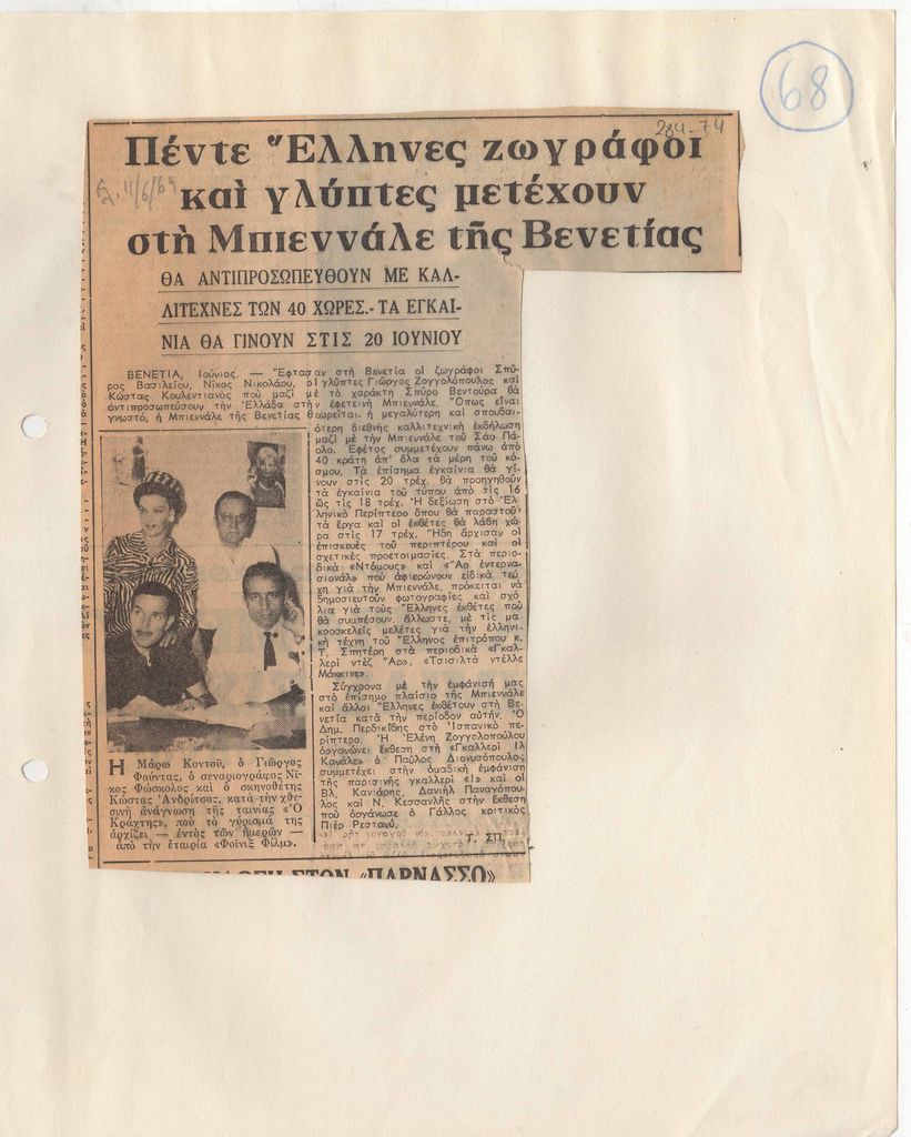 Απόκομμα, χαρτί ακανόνιστου μεγέθους επικολλημένο σε λευκή κόλλα, 29×21 εκ., στα ελληνικά. Δημοσίευση άρθρου του Τώνη Σπητέρη, στο οποίο γίνεται αναφορά στις ελληνικές συμμετοχές στην Μπιεννάλε Βενετίας 1964 και στη συνολικότερη διοργάνωση.