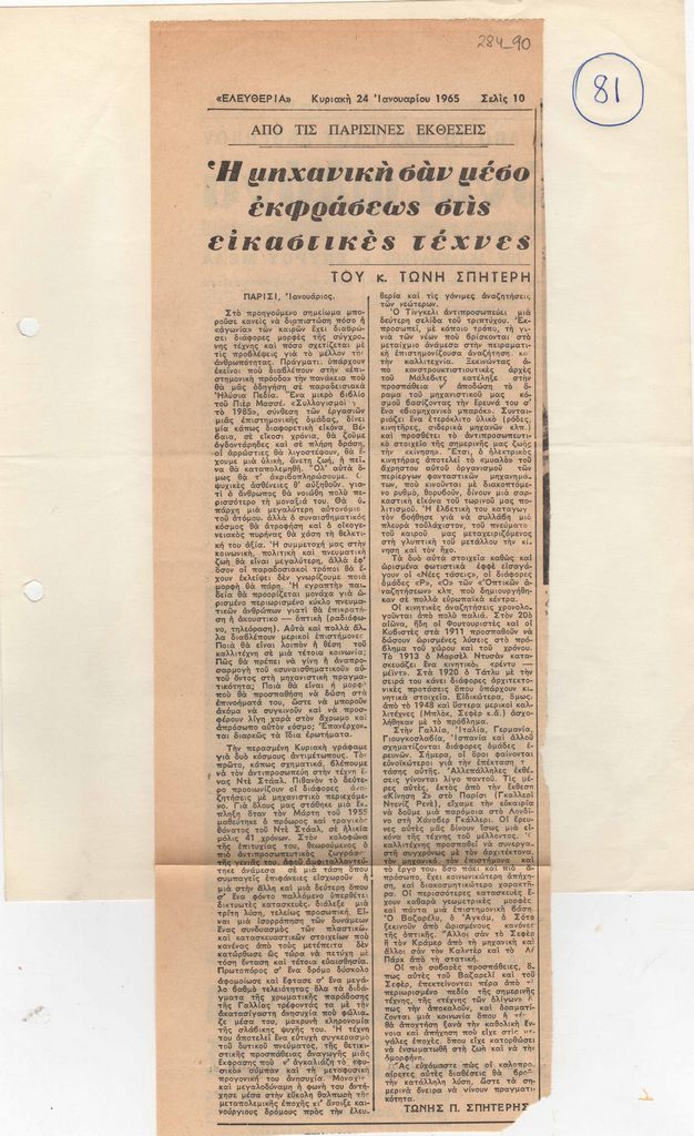 Απόκομμα, χαρτί, 33×12 εκ., επικολλημένο σε λευκή κόλλα, 29×21 εκ., στα ελληνικά. Δημοσίευση άρθρου του Τώνη Σπητέρη, στο οποίο αναφέρεται στην εξέλιξη της τέχνης και ειδικότερα στην είσοδο της μηχανικής στη σύγχρονη τέχνη και στην εξέλιξη της κινητικής τέχνης.