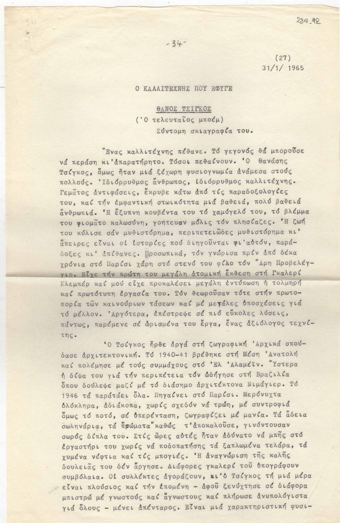 Δακτυλόγραφο κείμενο του Τώνη Σπητέρη, ριζόχαρτο, 30×21 εκ., στα ελληνικά. Αναφέρεται στη ζωή και στο έργο του Θάνου Τσίγκου, με αφορμή τον θάνατο του καλλιτέχνη.
