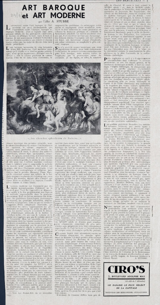 Απόκομμα του περιοδικού “Les Beaux-Arts”, έντυπο, στα γαλλικά, χαρτί, διπλής όψης, 60×43 εκ., όπου δημοσιεύεται άρθρο του A. Stubbe για το Μπαρόκ στην τέχνη και την μοντέρνα τέχνη. Το απόσπασμα εικονογραφείται. Αριστερά από τον τίτλο, επιγραφή με τα στοιχεία έκδοσης. Στο ίδιο απόκομμα: A. E. “Les expositions”.